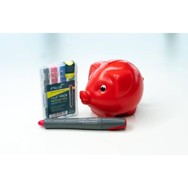 Die Pica-VISOR-Gelminen bestehen aus einer wasserlöslichen Gel-Wachs-Mischung. Sie kommt ohne Lösungsmittel und ohne Trennmittel aus, ist geruchsneutral sowie staubfrei. Dass Sie zum Entfernen der Marker-Aufzeichnungen von allen geeigneten Oberflächen keine chemischen Reinigungsmittel benötigen, versteht sich dabei schon von selbst.