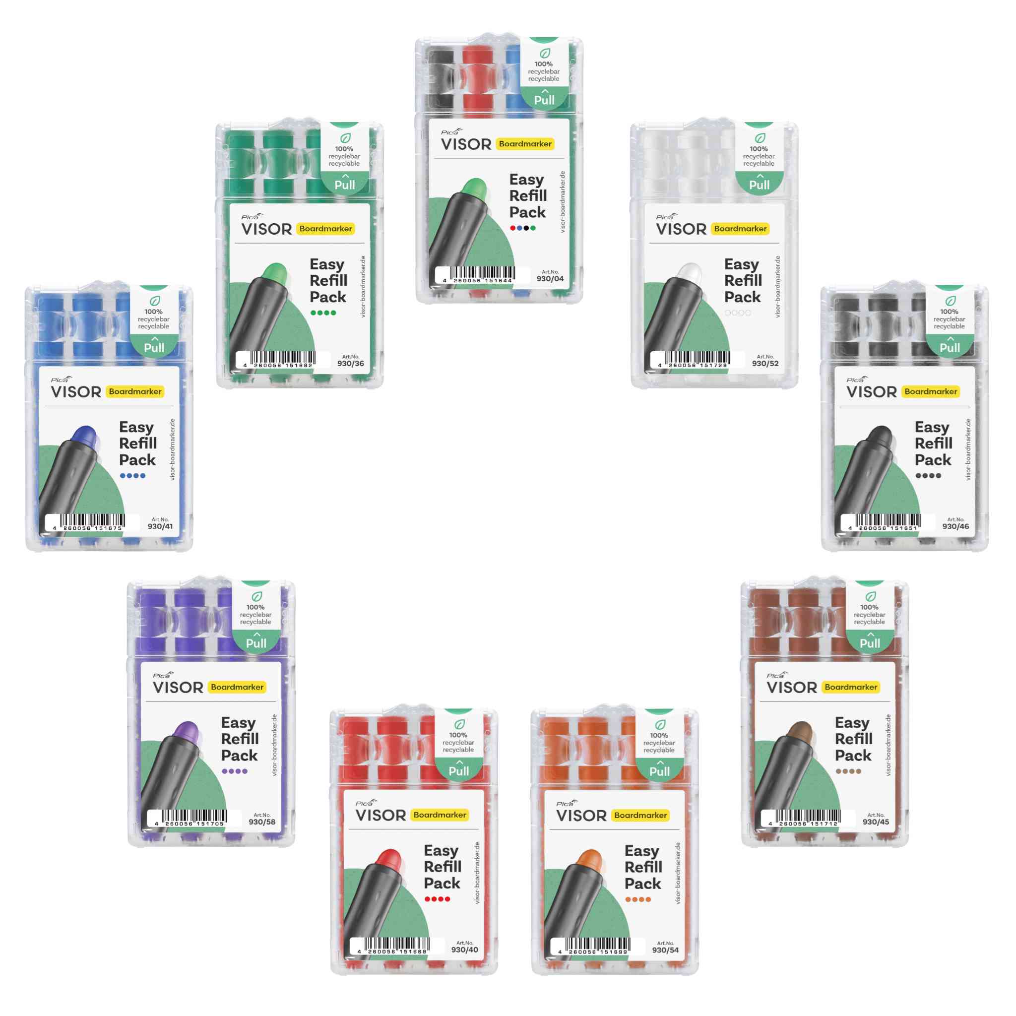 Das Pica VISOR Nachfüllpack, 4 Stück, enthält 4 hochwertige Ersatzminen für Ihre Pica-VISOR-Whiteboard-Marker. Verpackt in einem bruchsicheren und wiederverschließbarem Etui aus recyceltem Kunststoff, bewahren Sie die Minen gut geschützt und nachhaltig auf. Die Sets sind in unterschiedlicher Farbauswahl verfügbar (bitte wählen).