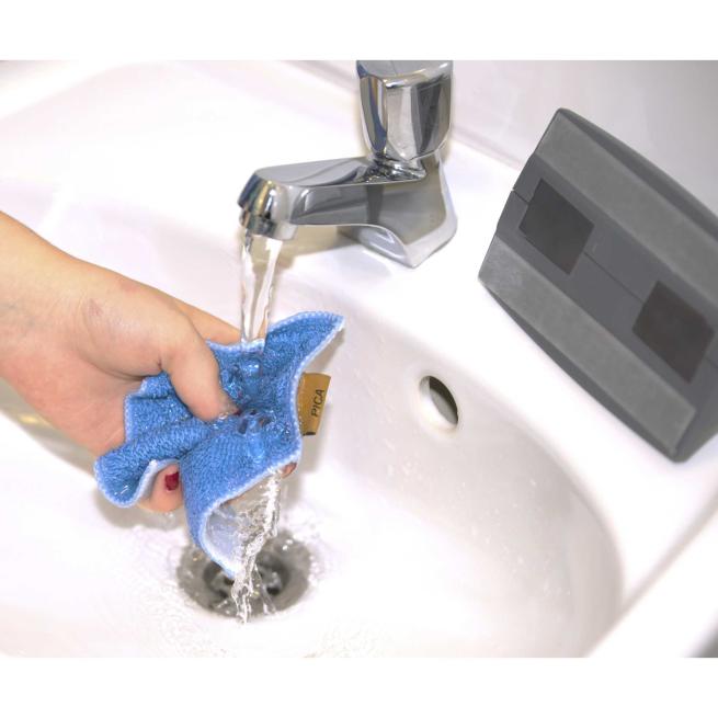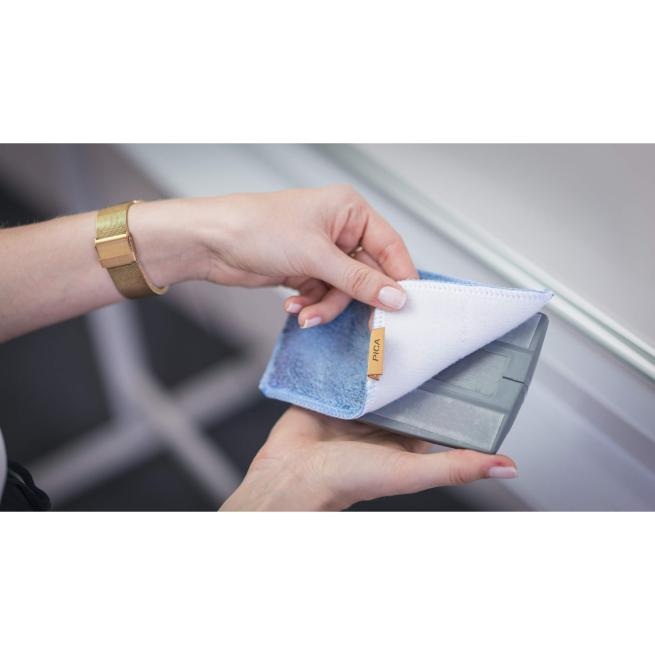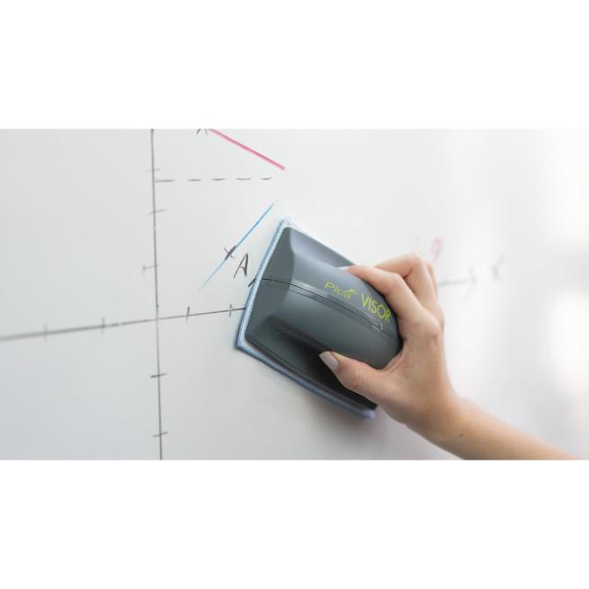 Der ergonomische und magnethaftende Pica-VISOR-Whiteboard-Wischer ist mit einem Mikrofaser-Pad (15 x 10 cm) zum Trockenwischen ausgestattet. So entfernen Sie die Gel-Marker-Aufzeichnungen rückstandsfrei. Das Mikrofaserpad nimmt die Gel-Farbpartikel vollständig auf, wodurch beim Wischen zudem kein Feinstaub entsteht. Waschen Sie das Pad nach der Benutzung unter fließendem, kaltem Wasser aus und lassen Sie es vor erneuter Benutzung trocknen (beachten Sie auch die weitergehenden Pflegehinweise des Herstellers). Einfache Befestigung am Wischer über Klettstreifen, Pad dadurch zudem im Handumdrehen austauschbar.