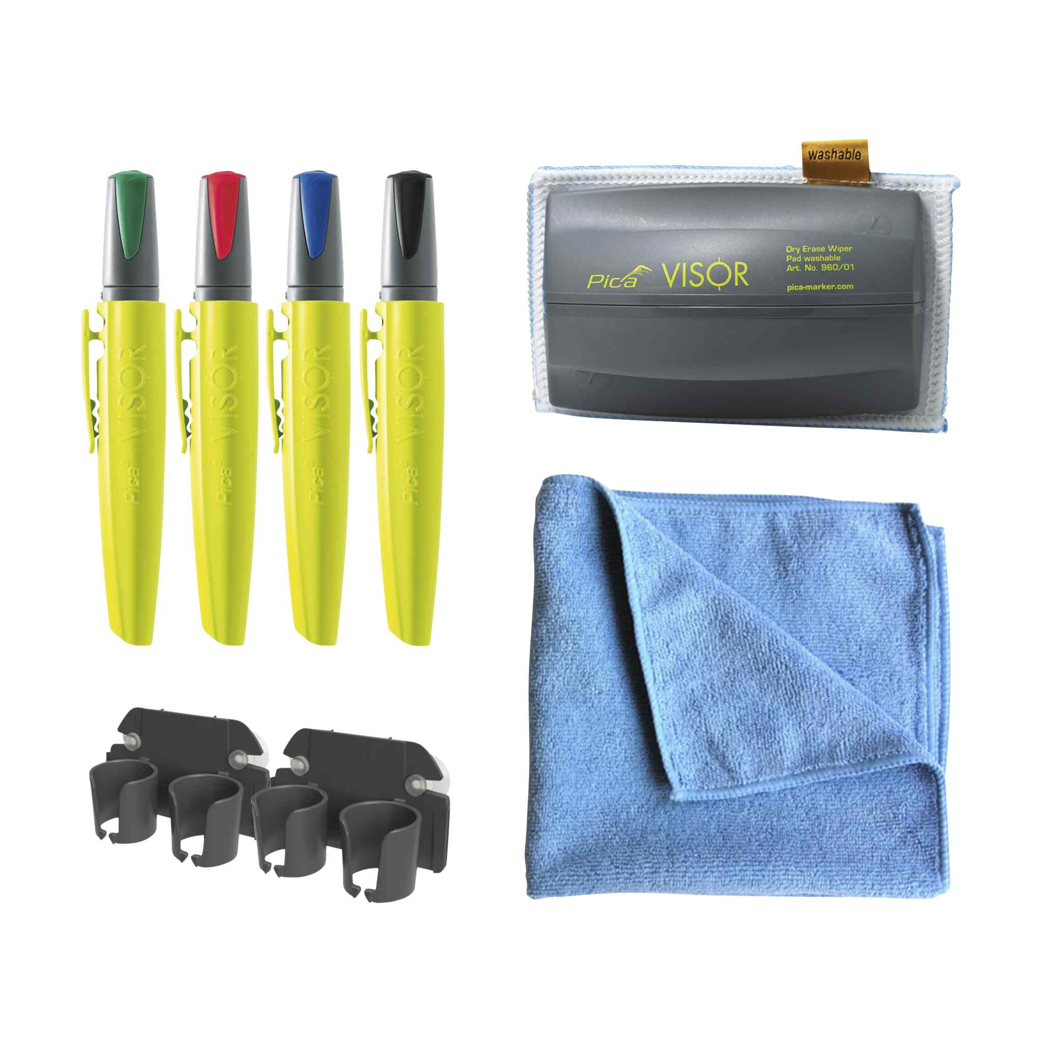 Das VISOR Whiteboard-Set STARTER bietet Ihnen die volle Grundausstattung für den Einsatz im Schul-Alltag. Sie erhalten 4 langlebige und nachfüllbare Whiteboard-Marker (je 1 in Rot, Blau, Grün und Schwarz), 1 magnethaftenden Whiteboard-Wischer mit Mikrofaser-Pad in 15 x 10 cm, 1 Mikrofasertuch in 40 x 40 cm sowie 2 starke Magnethalter für insgesamt 4 Marker.