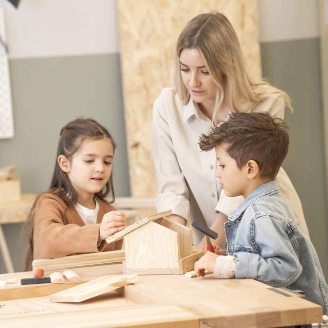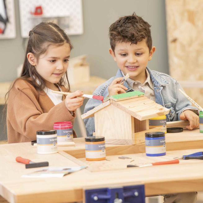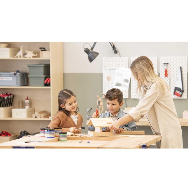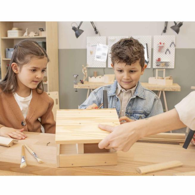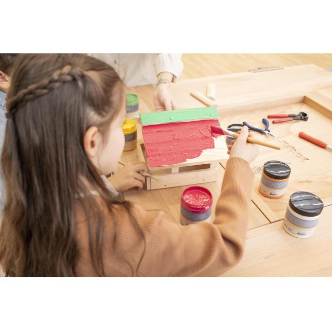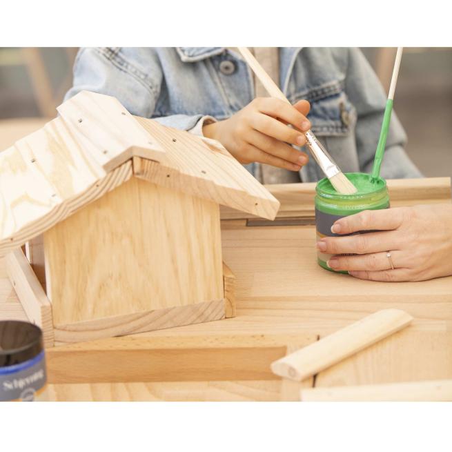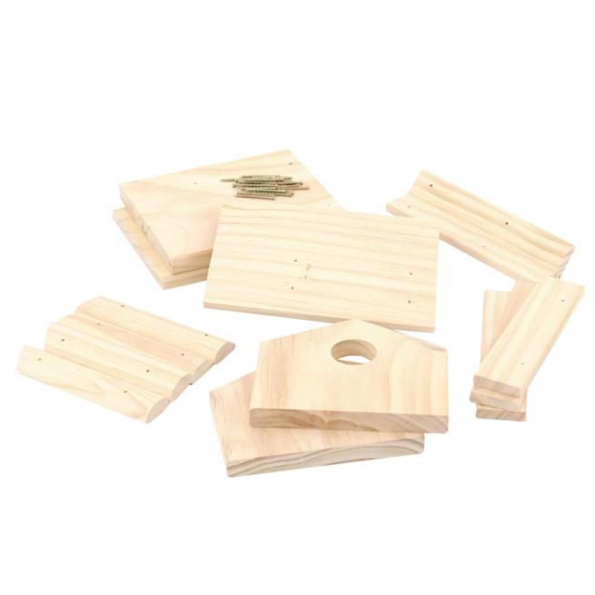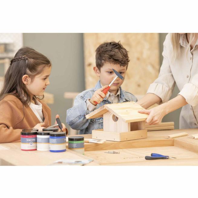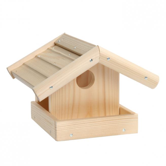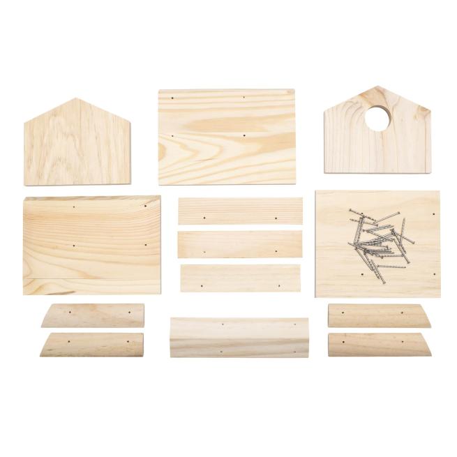 Futterstelle für den Außenbereich. Den vorgebohrten und passgenau gefrästen Vogelhaus-Bausatz fixieren Sie mit den 30 Nägeln. Anschließend bemalen Sie das Häuschen mit Ihren Kindern, bestücken es mit Futter und beobachten draußen die neuen gefiederten Freunde.