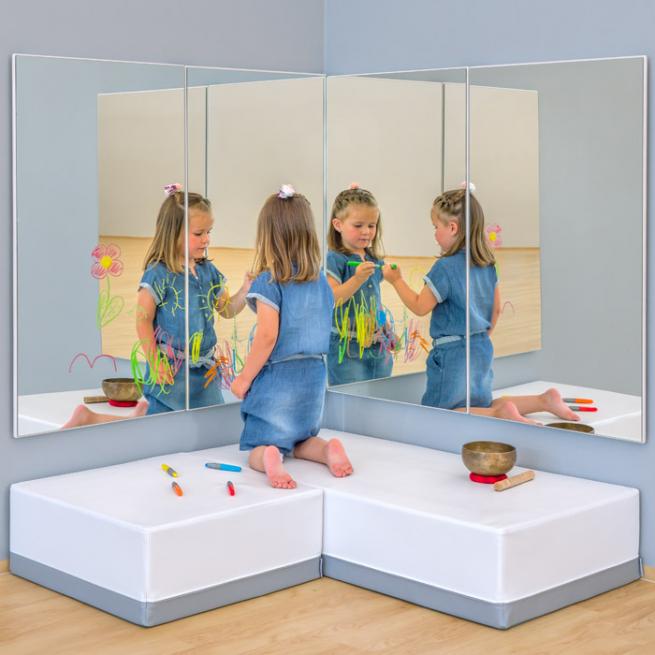 Die Wandspiegel aus Sicherheitsglas sind optimal geeignet für Sinnes- und Ruheräume. Spiegel stärken die kindliche Selbstwahrnehmung. Die passende Wandverkleidung für Sinnesräume!