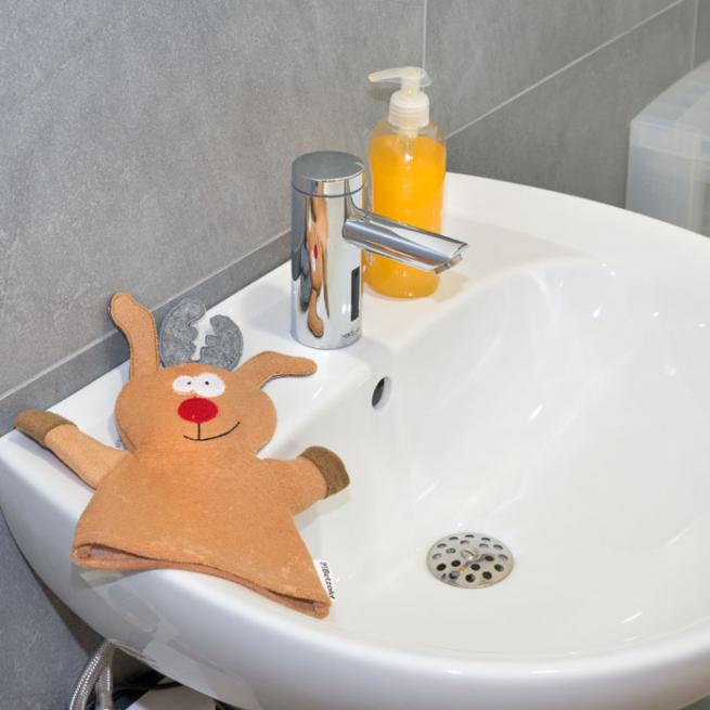 Mit dem putzigen Waschhandschuh Rudi Rentier macht die Bad- bzw. Waschraumroutine nicht nur zur Weihnachtszeit besonders viel Spaß. Dank Aufhängeschlaufe ist der Waschhandschuh sofort griffbereit. Auch optimal als kleines Geschenk oder sogar Deko auf dem kindlichen Weihnachtstisch.