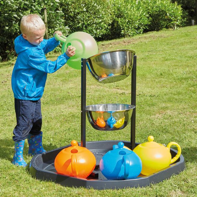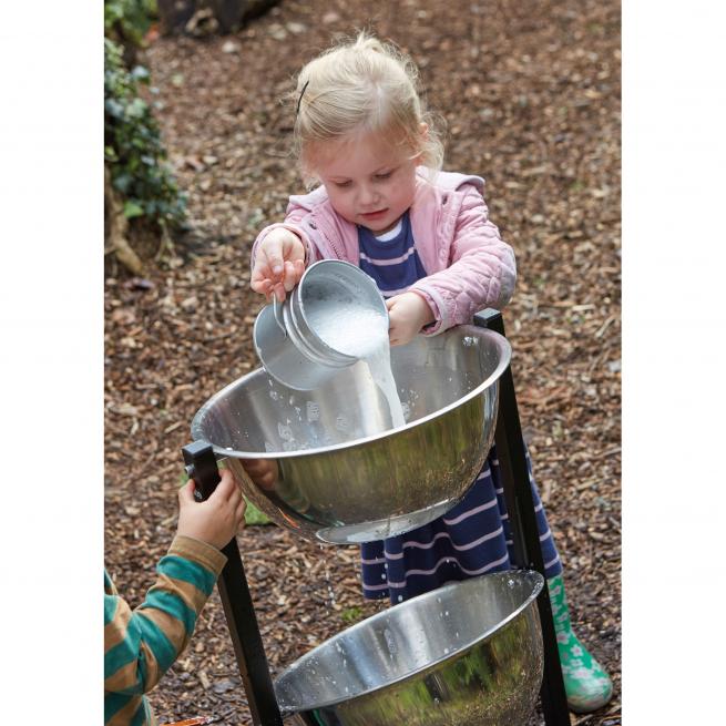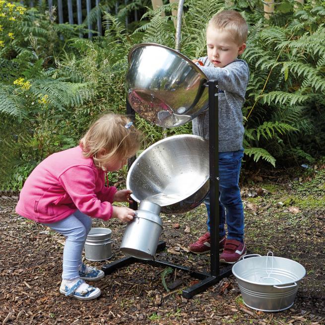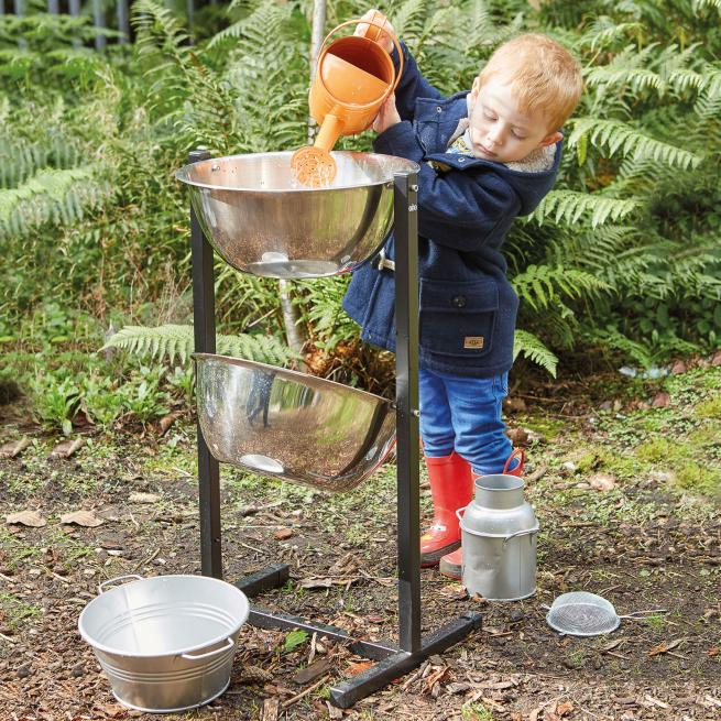Die robuste Konstruktion mit zwei Metallschüsseln eignet sich bestens für erste Experimente mit dem Element Wasser. Die Kinder beobachten fasziniert wie sich das Wasser in den Schüsseln sammelt und von oben nach unten läuft, je nachdem wie stark die Schüsseln gekippt werden. Das Gestell stecken Sie einfach zusammen und schrauben die Metallschüsseln ein.