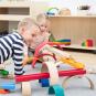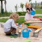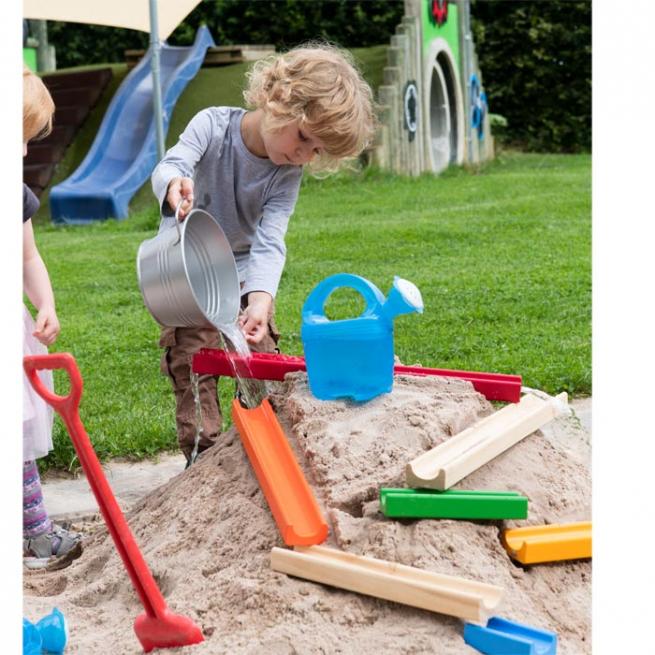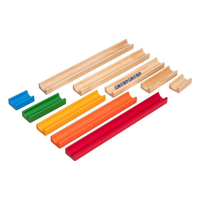 Auf dem Bauteppich oder im Sandkasten bauen Kinder aus den unterschiedlich langen naturbelassenen und regenbogenfarbenen Elementen ihre individuelle Wasser- und Murmelbahn. Und mit den enthaltenen Murmeln geht der Spaß sofort los. Ab 3 Jahren.