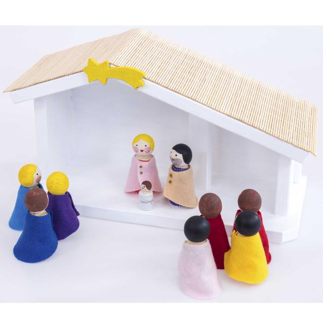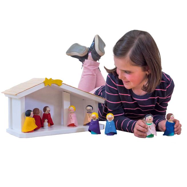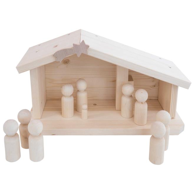 Anschauliches Gruppenprojekt rund um die Weihnachtsgeschichte. Mit Ihren Kindern kleben und schrauben Sie die einzelnen Krippenteile aus Massivholz schnell zusammen. Einen individuellen Anstrich erhalten die Krippe und die 10 minimalistischen Holzfiguren mit Farbe (bitte separat bestellen). Anhand der Figuren erzählen Sie anschließend zusammen die Weihnachtsgeschichte rund um Jesu’ Geburt und platzieren Maria, Josef, die heiligen drei Könige, die Hirten und den Engel.