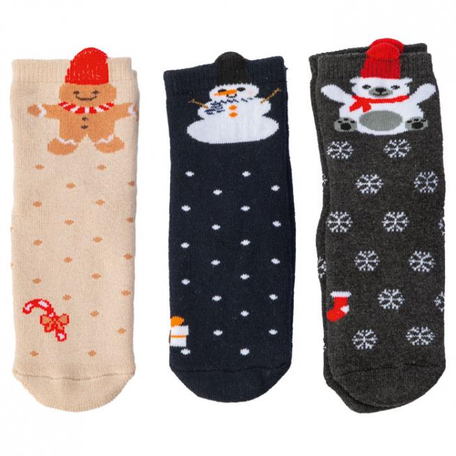 Perfekte Begleiter für den Winter. Die Weihnachtssocken im Schneemann-, Lebkuchenmännchen- oder Eisbär-Dessin mit Anti-Rutschnoppen halten Kinderfüße schön warm, wenn mal die Hausschuhe fehlen. Auch ein drolliges Geschenk für den Adventskalender. Jedes Motiv im 3er-Set je 1x vorhanden.