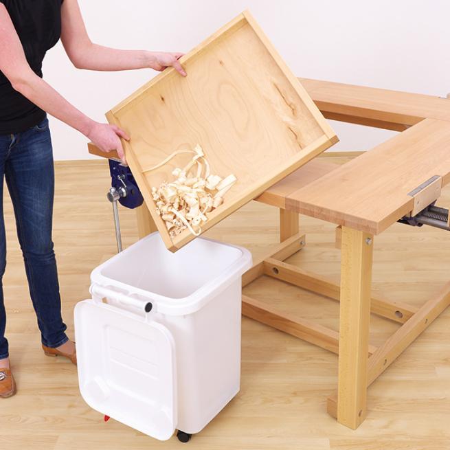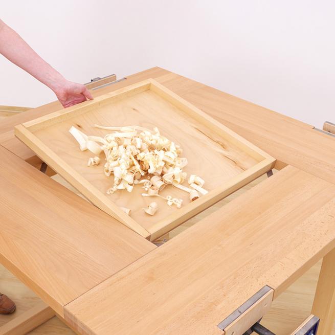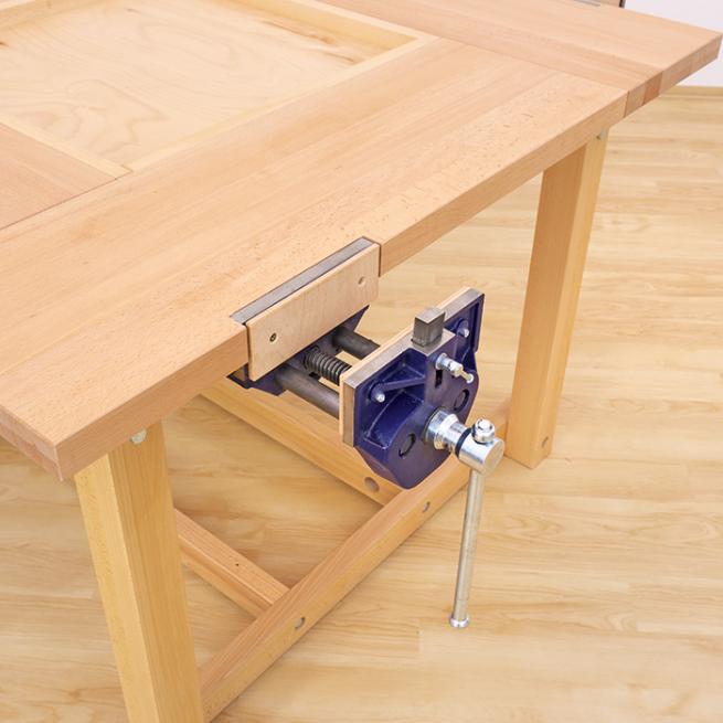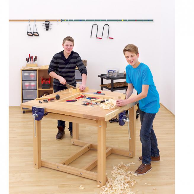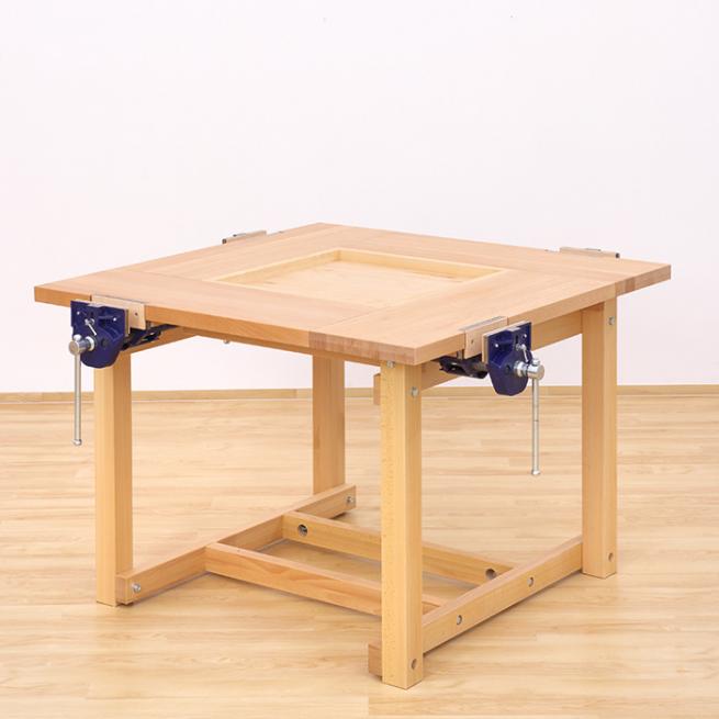 Die massive Arbeitsfläche ist 40 mm stark und sehr robust. An jeder der 4 Arbeitsplätze befindet sich ein Schraubstock. In der Mitte ist eine quadratische Werkplatte eingelassen. Diese kann als sichere Ablage für Werkzeug oder als Rinne benutzt werden. Zum einfachen Säubern ist diese Platte herausnehmbar.