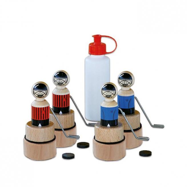 Die Spielfiguren bewegen sich wie von selbst übers Spielfeld. Unter dem Tisch bewegt der Spieler einen Magneten und führt so die Figur. Da kommt es auf Geschicklichkeit und Augenmaß an. Feinmotorik und Auge-Hand-Koordination werden optimal trainiert. Für 2 – 4 Spieler.