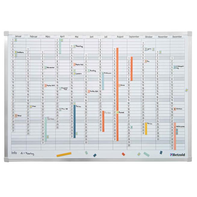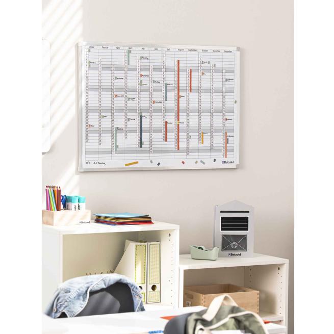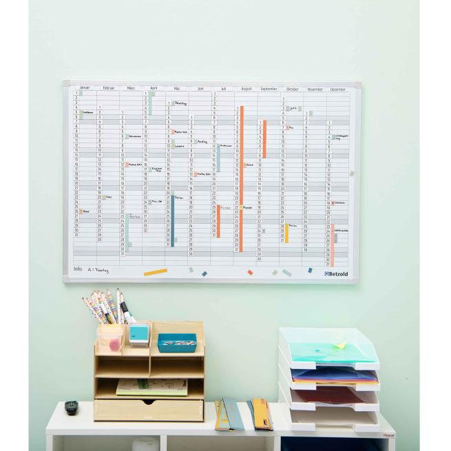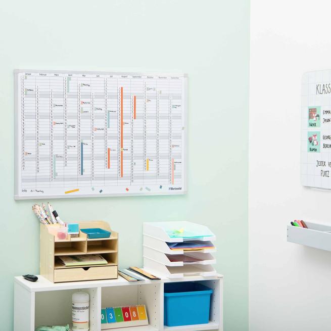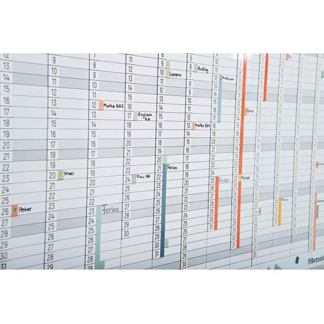 Dank des umfangreichen Zusatzmaterials personalisieren Sie den Kalender im Handumdrehen und passen ihn jedem Zweck an. Nutzen Sie die einfarbigen und unterschiedlich langen Magnetplättchen und Magnetstreifen (enthalten in den Farben Rot, Gelb, Grün und Blau), um spezielle Themen zu kennzeichnen, z. B. den Unterricht in einzelnen Fächern oder den Stundenplan einzelner Lehrender. Verwenden Sie die Streifen und Plättchen ebenfalls, um Klausurphasen, Ferienzeiten, Klassenfahrten oder andere Zeiträume hervorzuheben.