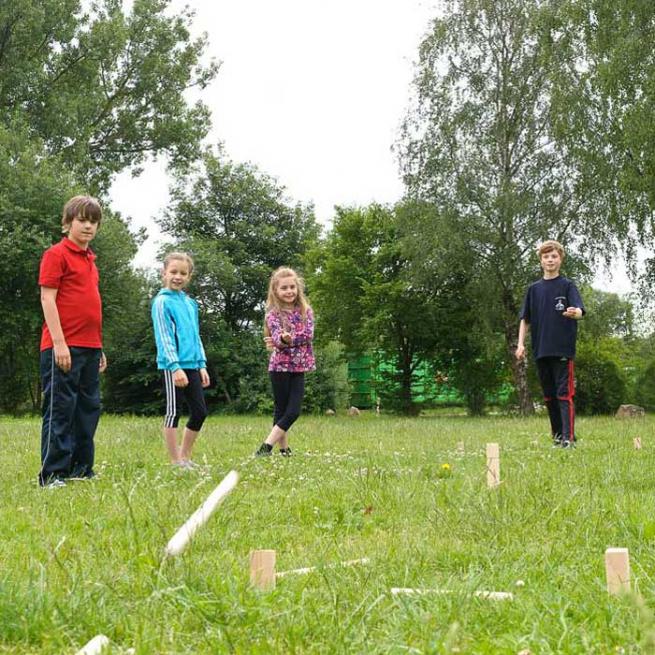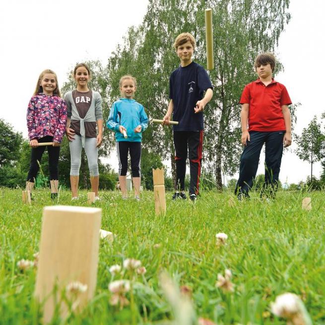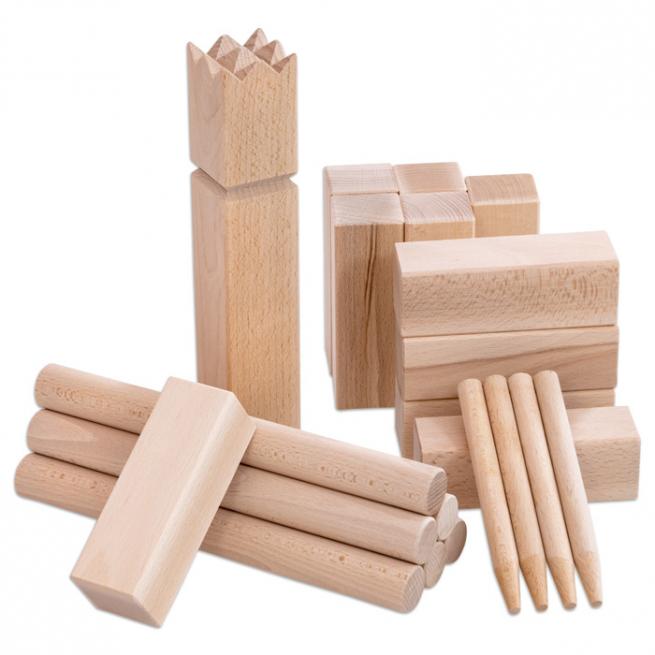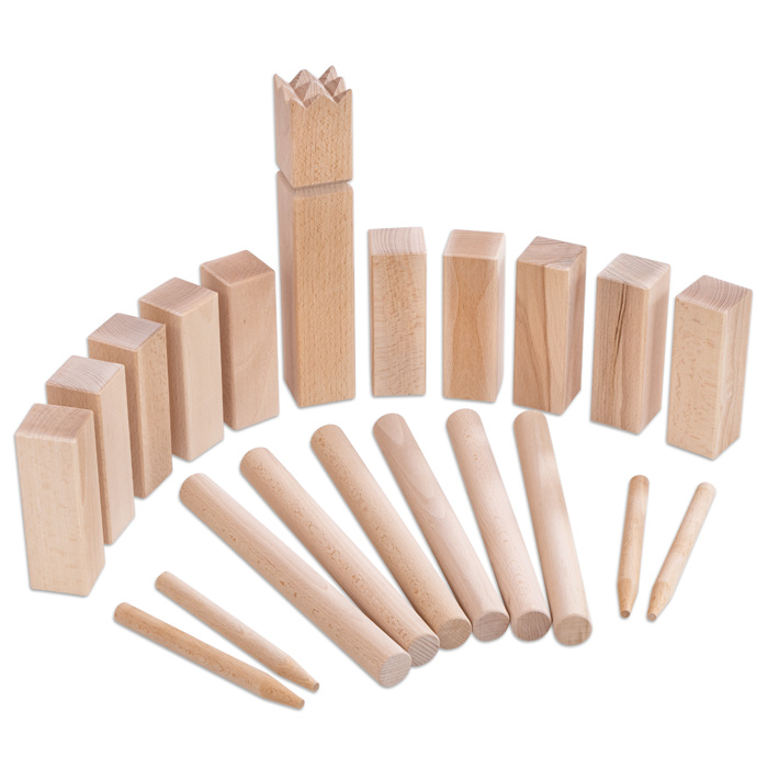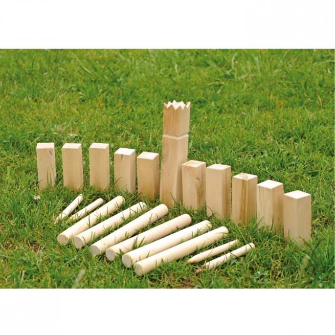Bei diesem Spiel sind 2 bis 12 Personen im Freien in Aktion: abwechselnd muss jede Mannschaft mit Wurfstäben erst die 5 gegnerischen Holzklötze (Bauern) und schließlich den König zu Fall bringen. Es muss lediglich eine relativ ebene Fläche von ca. 8 x 5 m gefunden werden und schon geht’s los. Die Mannschaft mit der besten Strategie und dem größten Wurfgeschick gewinnt.