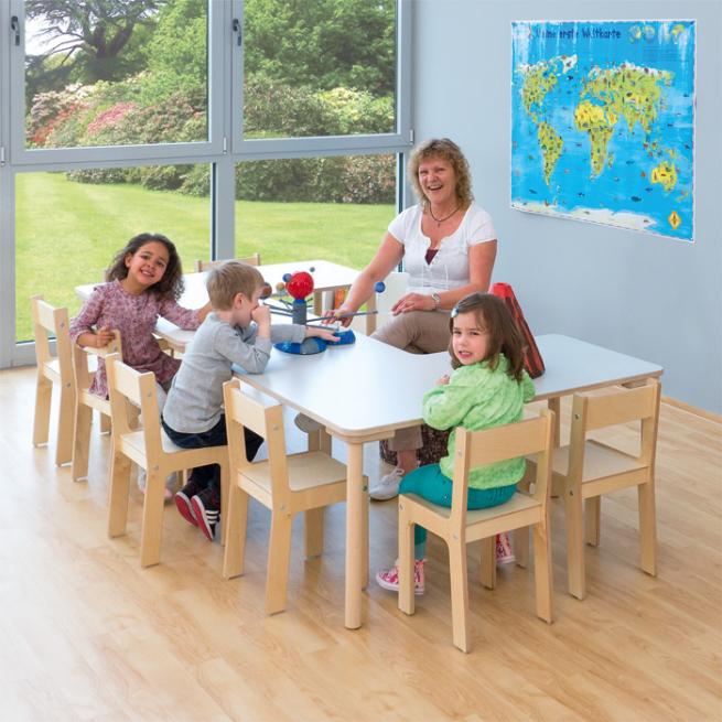 Speziell für Kinder U3 konzipiert. Diese Tischserie aus Birkenholz zeichnet sich durch ihre stark abgerundeten Ecken aus. Die Kleinen sind vor Stoßverletzungen geschützt und essen, sitzen oder spielen gern auch mal am Tisch. Die Tischplatte aus Birke-Multiplex ist dank beidseitiger Beschichtung besonders kratzfest. Stabilen Halt haben die Tische dank der Beine aus geöltem Birken-Massivholz. Zudem schützen die integrierten Gleiter Gehör und Boden. Nutzen Sie die wendbaren Gleiter je nach Boden entweder mit der Filz- oder Kunststoffseite. Kombinieren Sie die Tische nach Lust und Laune – die hellen Tischplattenfarben geben Ihrer Einrichtung einen frischen Look.