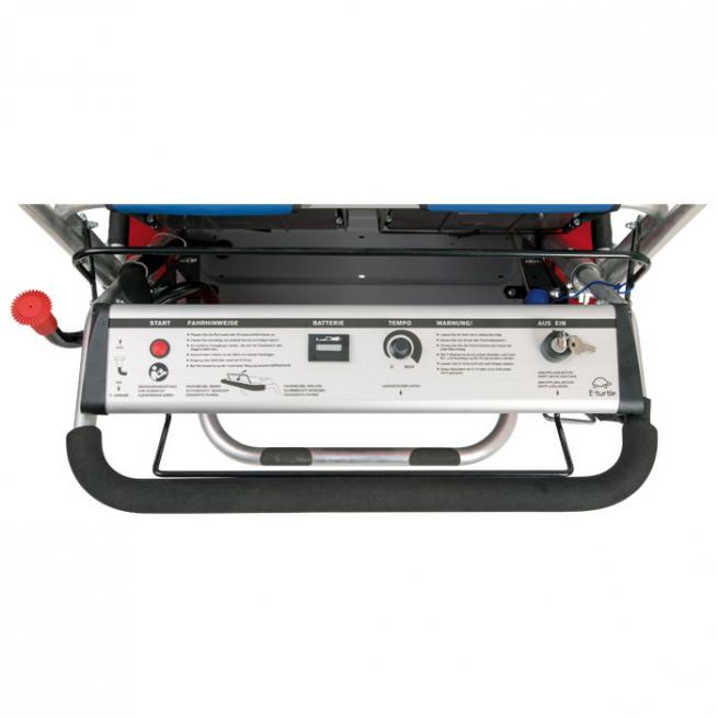 Die Handhabung des ergonomischen E-Turtle-KiGa-Busses ist sehr einfach. Er lässt sich leicht schieben und lenken und unterstützt Sie so merklich bei Steigungen bis zu 15 %. Sein Motor ist von außen nicht sichtbar. Direkt am Lenker befindet sich das übersichtliche Bedienfeld für den Antrieb. Dessen benutzerfreundliche Steuerung ermöglicht die stufenlose Geschwindigkeitsregulierung für müheloses Vor- und Rückwärtsfahren. Der E-Turtle bremst automatisch, wenn der Lenker losgelassen wird.