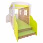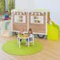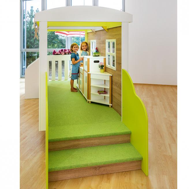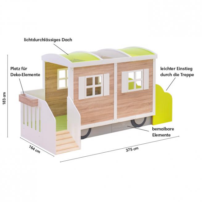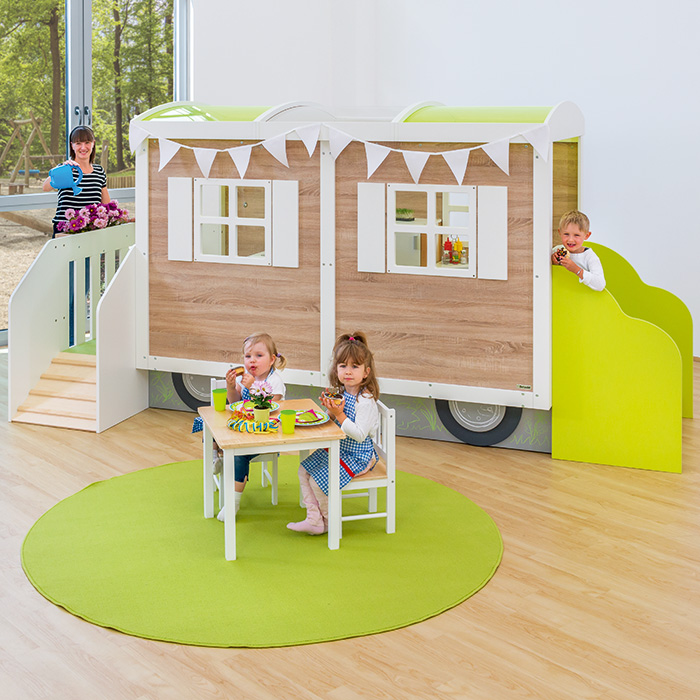 Das tolle Design bringt gleich gute Laune. Der Wohnwagen motiviert Ihre Kinder zu immer neuen Spielideen und fantasievollen Rollenspielen. Dazu bietet er reichlich Platz für viele Aktivitäten. Gleich mehrere Kinder spielen hier gleichzeitig. Eine Treppe und eine Rampe erleichtern Ihren Kleinen den Ein- und Ausstieg. Durch das Dach aus grünem und weißem Acrylglas gelangt viel Licht ins Innere. Der grüne Tretford Teppich sorgt beim Spielen für Wohlfühlatmosphäre. Außen lädt die integrierte Tafelfläche am unteren Teil des Wohnwagens zum kreativen Bemalen ein. Acrylglasfenster in Scheibenoptik und ein Blumenkasten am Balkon bereichern die liebevolle Gestaltung. Zur einfachen Selbstmontage. Aufbauzeit ca. 1 Stunde (2 Erwachsene). Deko bitte separat bestellen.