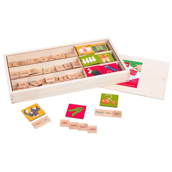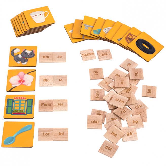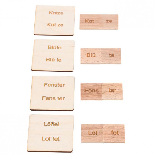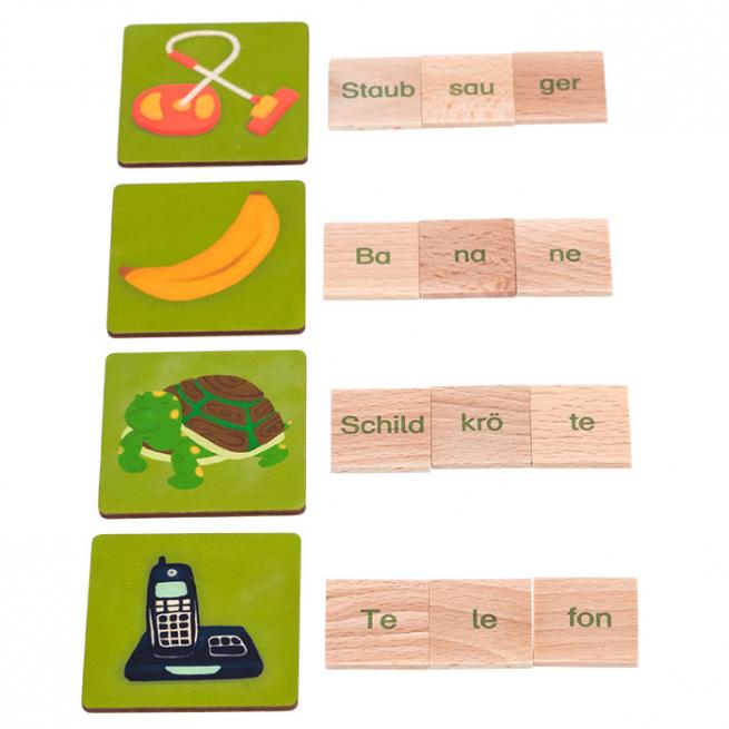• je 20 Bildkärtchen für Zweisilber, Dreisilber und Viersilber mit 180 dazugehörigen Silbenplättchen aus Holz