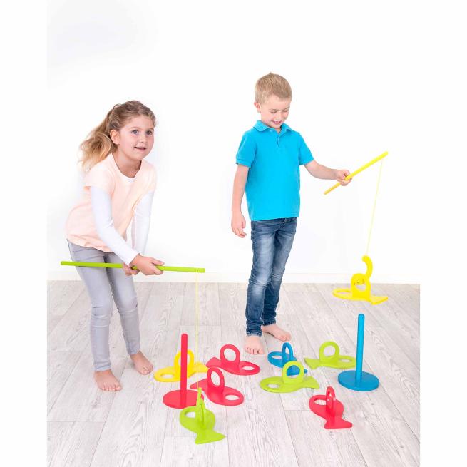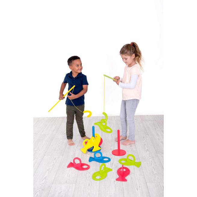 Los geht's mit dem Angelspaß. Wer kann am schnellsten drei Fische derselben Farbe auf den Stab fädeln? Oder wer stapelt die meisten Fische? Schaut danach auf der Unterseite der Fische und entdeckt, wer die meisten Punkte gesammelt hat. Ein Angelspiel, das viele Möglichkeiten bietet. Ab 4 Jahren.