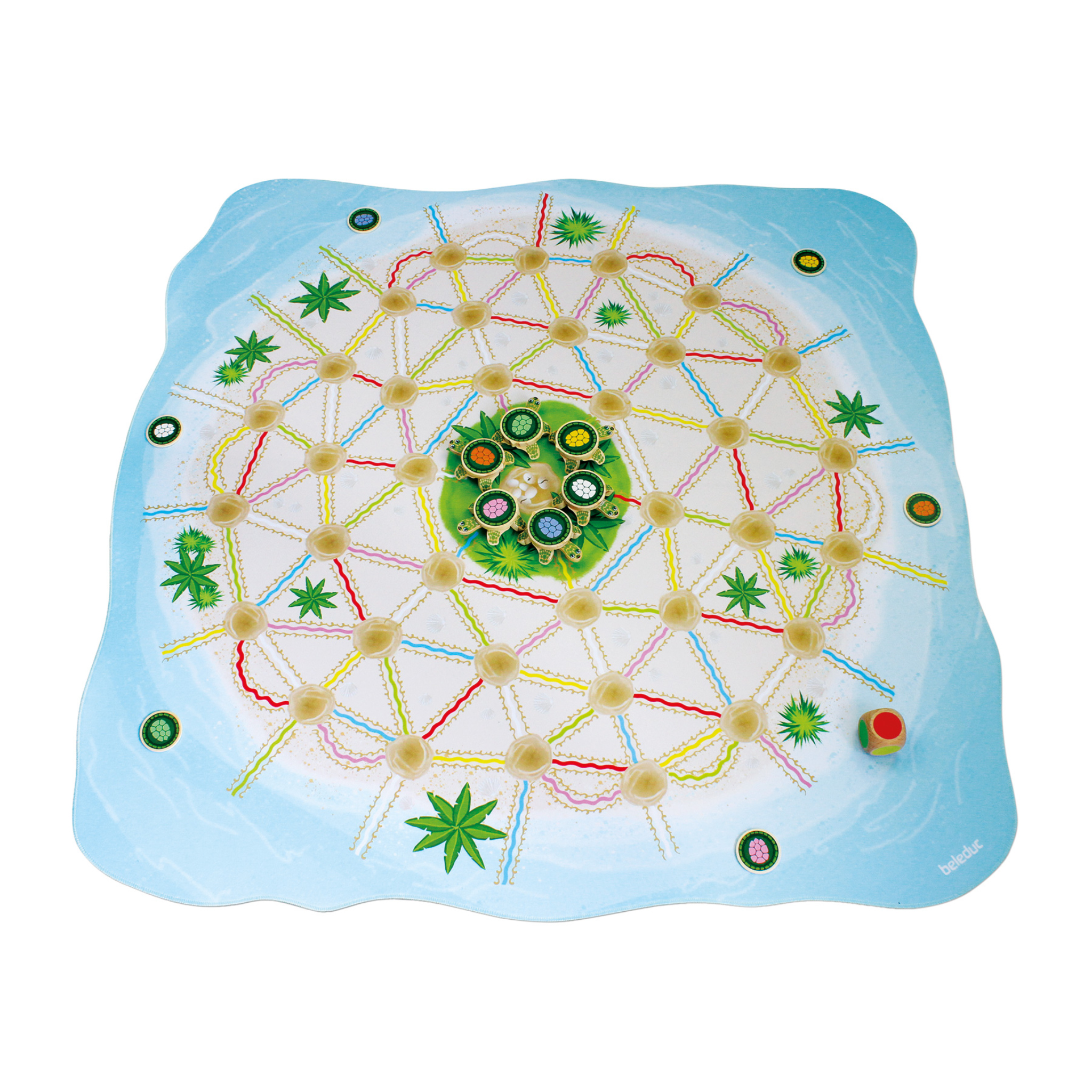 Auf einer Insel mitten im Ozean sind die Meeresschildkröten geschlüpft. Aus der Ferne hören sie das Rauschen des Meeres und jede will das Wasser erreichen, um ihre große Reise zu beginnen. Hilf ihnen, den Weg von ihrem Nest ins Meer zu finden. Der Farbwürfel zeigt an, welchen Weg die Schildkröte eines Spielers jeweils nehmen kann.