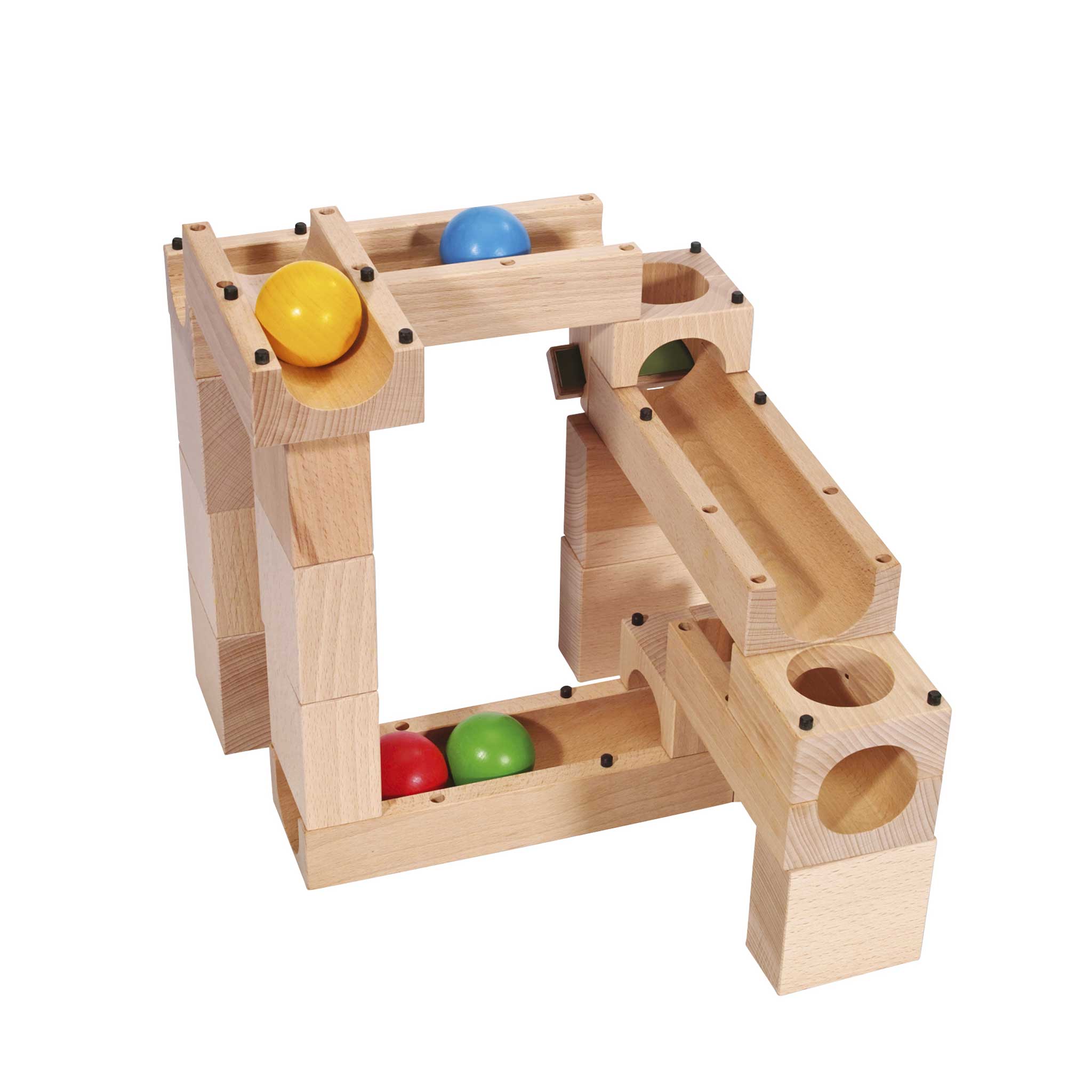 Sobald eine der Kugeln die Klangklötze trifft, erzeugen diese angenehme Töne. Die Kinder lauschen konzentriert und schulen dadurch ihr Gehör. Die Kugeln in vier verschiedenen Farben helfen dabei, Farben voneinander zu unterscheiden und schärfen den Sehsinn, wenn die Kinder die Kugeln auf ihrem Weg durch die Kugelbahnstrecken verfolgen und dazu mit dem Blick fixieren.