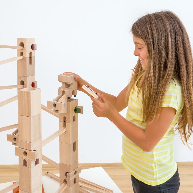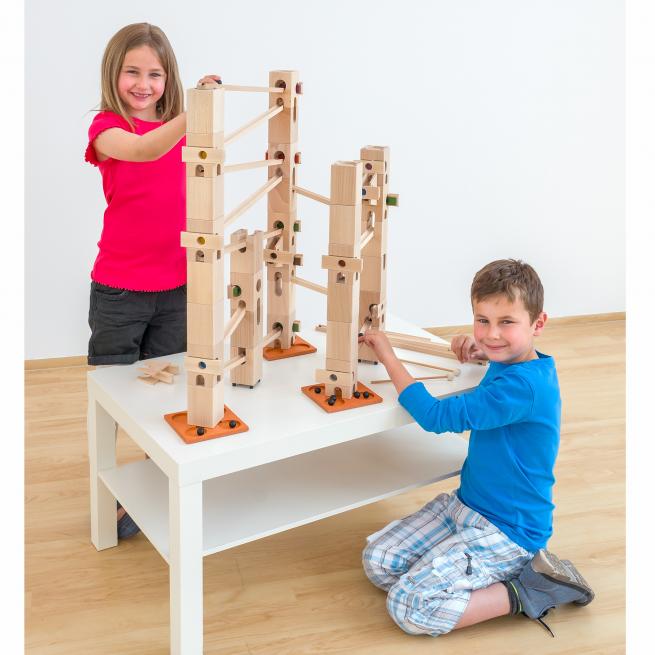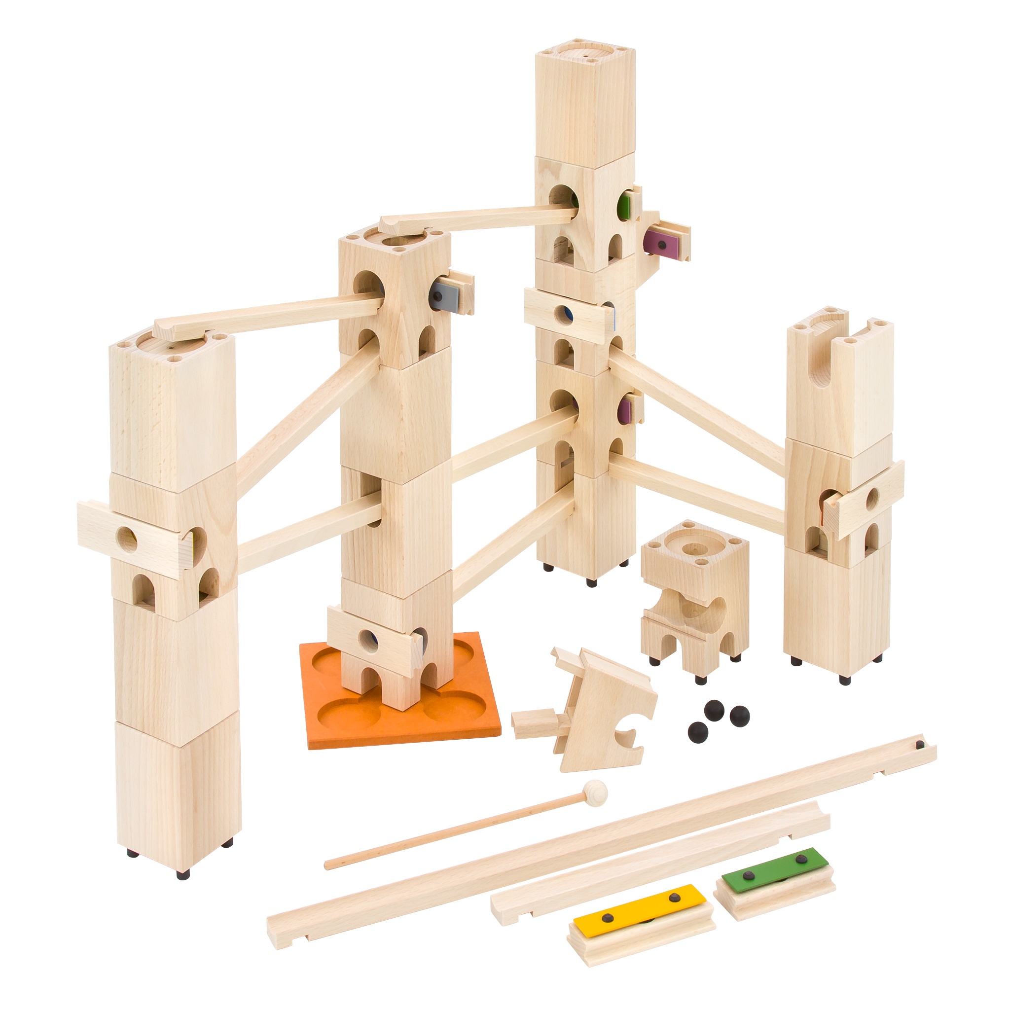 Das musikalische Holzspielzeug: Die Kugelbahn ist ein Riesenspaß für Kleine und Große. Kombinieren Sie mit Ihren Kindern die Buchenholzteile nach Lust und Laune.