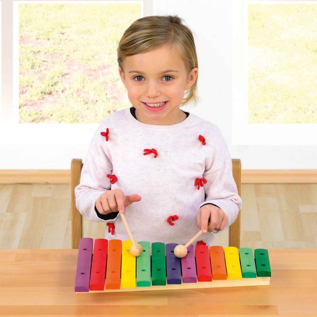 Mit diesem Xylophon fällt Ihren Kindern der Übergang zum Stabspiel und das Notenlernen leicht. Denn die Klangplatten aus Holz sind auf die bekannten Farben der BOOMWHACKERS® abgestimmt und symbolisieren jeweils unterschiedliche Töne.