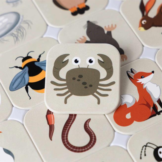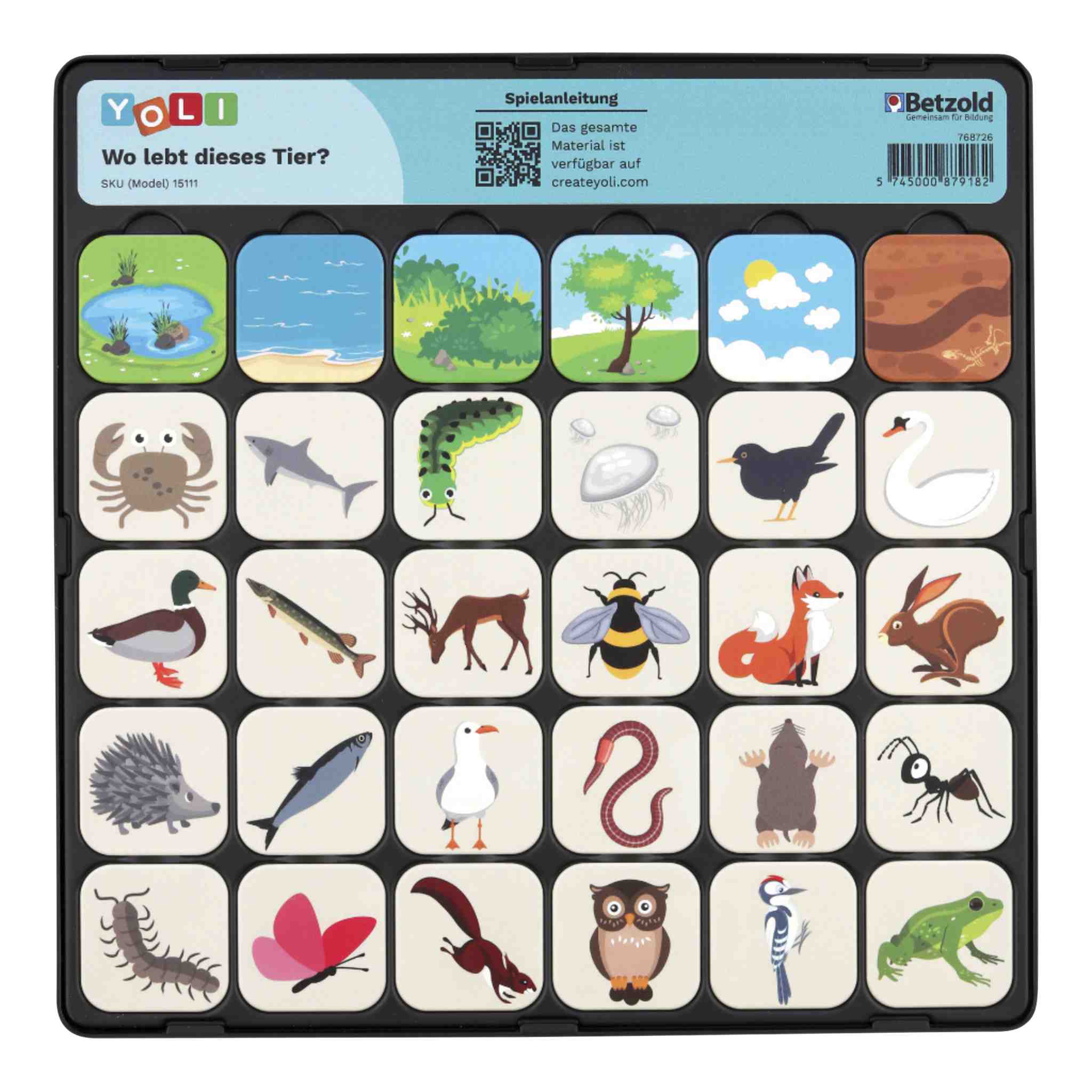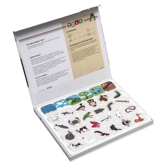 Wo leben Maulwurf, Specht und Regenwurm? Das YOLI-Spielset Wo lebt dieses Tier? zeigt auf 30 bunten Magnetkarten viele verschiedene Tiere und ihre Lebensräume. Die Kinder ordnen die tierischen Bewohner ihren natürlichen Habitaten zu und legen die zusammengehörenden Bildplättchen zu Kartenreihen aus. Für Abwechslung ist dabei reichlich gesorgt: So sind manche Tiere an unterschiedlichen Orten zu Hause, was variable Gruppierungen der Bildkarten möglich macht. Eine weitere Spielvariante: Die Kinder legen ein beliebiges Tier als „Startkarte“ aus und suchen aus dem Kartendeck weitere Tiere heraus, die im selben Lebensraum zu finden sind.