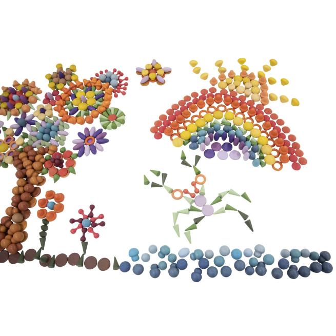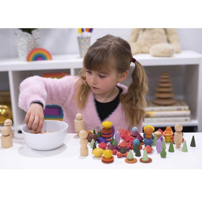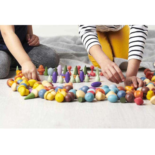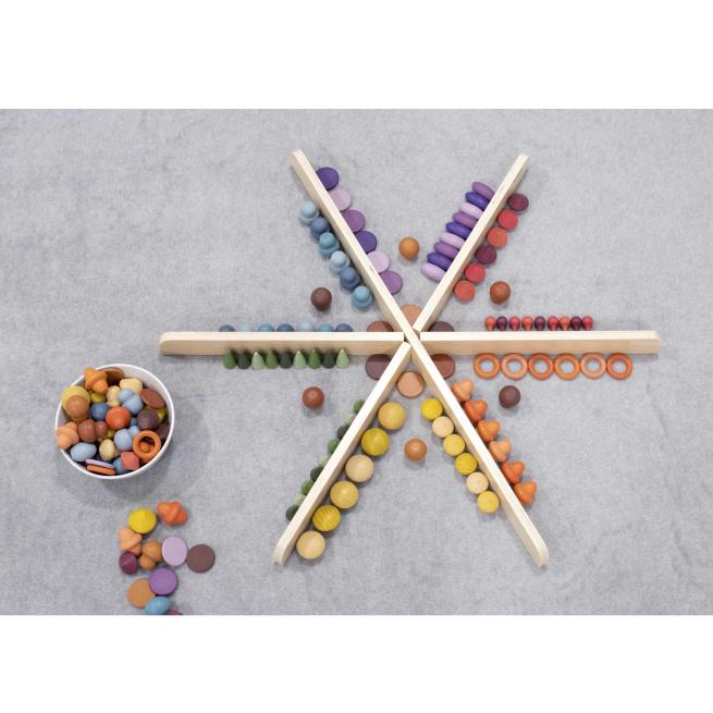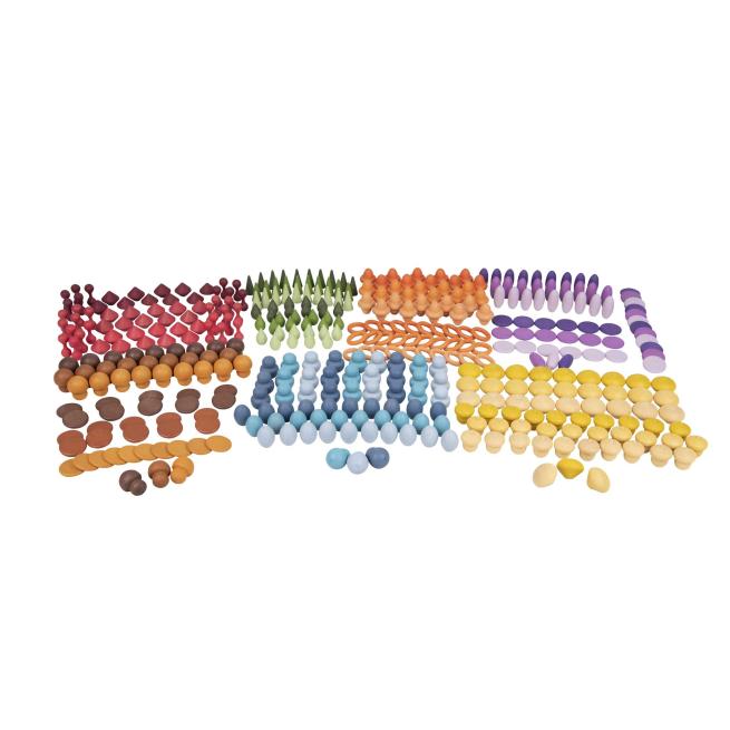 Die außergewöhnlichen Formen und Farben des Zähl- und Sortiermaterials motivieren Kinder zum Be-greifen, Sortieren und Zählen. Die glatten Holzteile mit natürlicher Maserung sind gut greifbar. Das Material unterstützt das spielerische Lernen und Entdecken. Auch optimal zum Erstellen von Bildern und Mustern.