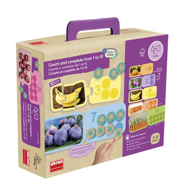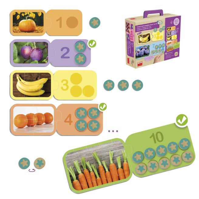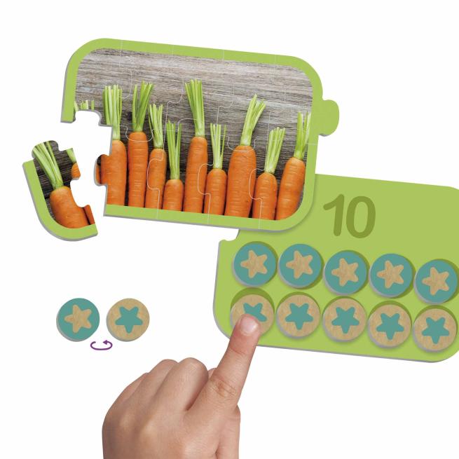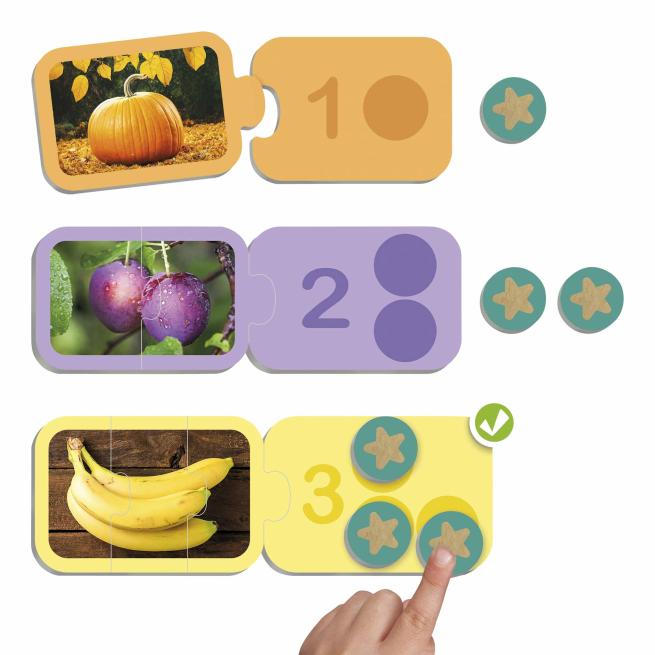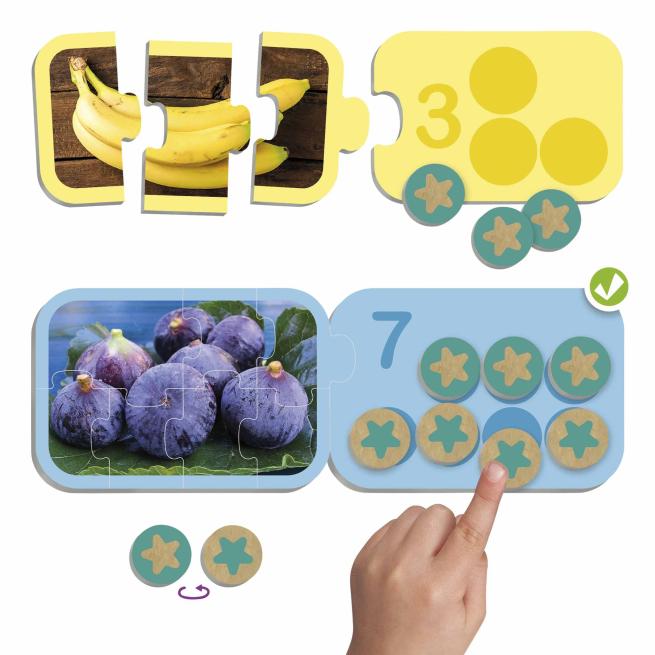 Die einzelnen Fotos zeigen eine bestimmte Anzahl eines je unterschiedlichen Lebensmittels, z. B. 1 Kürbis, 3 Bananen oder 10 Karotten. Die Fotos sind dabei in genauso viele Puzzlestücke zerteilt, wie es der jeweils abgebildeten Menge der Früchte etc. entspricht. Die Bildkarte, die mit einem Foto von 7 Feigen bedruckt ist, besteht also aus 7 Puzzlestücken. Zu jeder Bildkarte gehört eine Spieltafel, welche die zur Bildkarte passende Ziffer trägt und eine passende Zahl runder Felder besitzt.