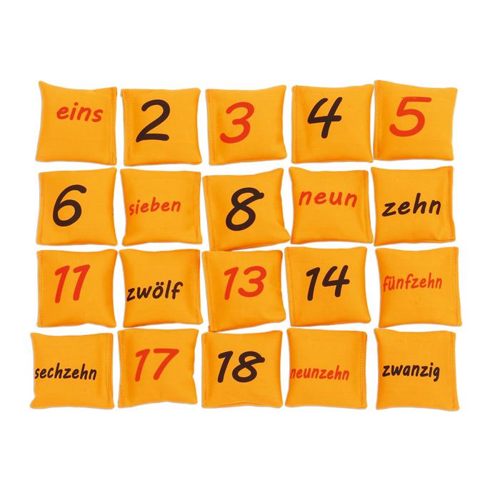 So gehts: Die ganze Gruppe bildet einen Kreis, jedes Kind bekommt ein Bohnensäckchen. Ein Kind wirft sein Säckchen einem anderen zu. Der Fänger bildet aus den beiden Zahlen eine Rechenaufgabe. Dann wirft er eines der Säckchen zum nächsten Kind.