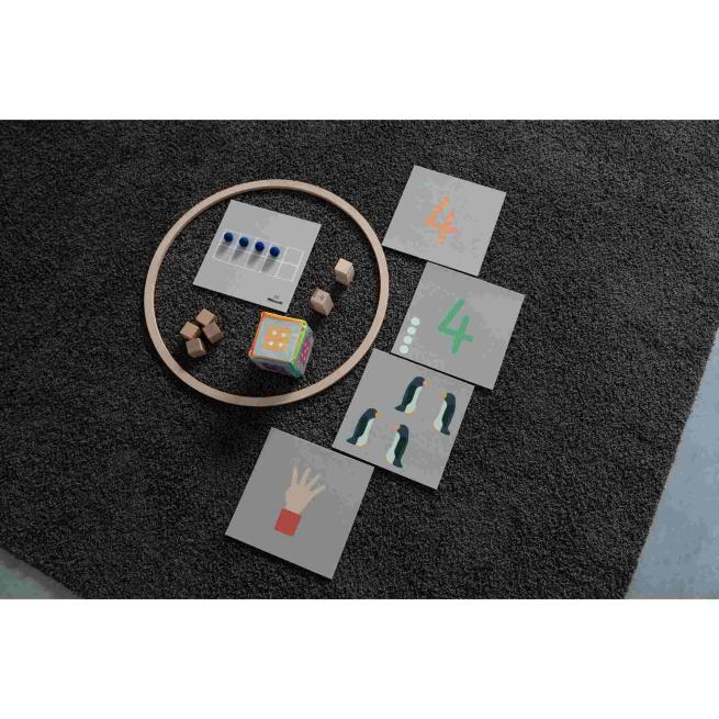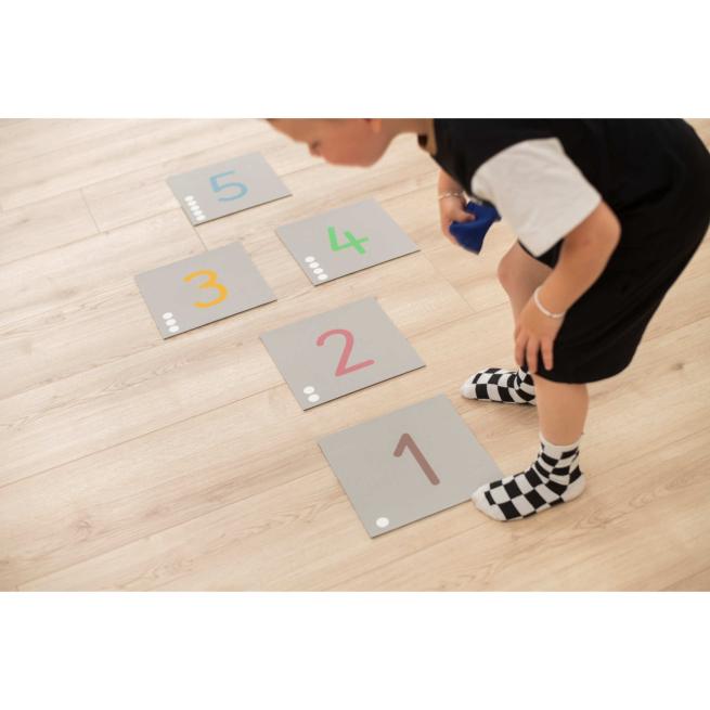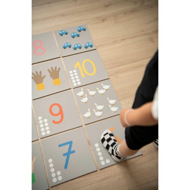 Nutzen Sie die Teppichfliesen für kreative Lern- und Bewegungsspiele, welche die Kinder auf vielseitige Weise kognitiv ansprechen. Durchmischen Sie z. B. die Fliesen und lassen Sie die Kinder in aufsteigender Reihenfolge von Zahl zu Zahl springen. Durch lautes Mitzählen lernen die Kinder dabei ebenfalls die Zahlwörter und festigen ihren Lernerfolg. Auch das Ausdenken kleiner Zahlenparcours, die kleine Geschichten rund um die cartoonhaften Mengendarstellungen erzählen, machen den Kindern Freude und sind eine spannende Abwechslung. Für erste Rechenübungen addieren oder subtrahieren die Kinder einzelne Zahlen und hüpfen dann auf die Fliese, die das korrekte Ergebnis zeigt.Das Springen, Suchen, Rechnen und Mitsprechen eröffnet umfangreiche Lernwege und trainiert sowohl das kindliche Zahlen- und Mengenverständnis als auch den mathematische Grundwortschatz. Zugleich verbessern die Kinder Motorik und Körperbeherrschung.