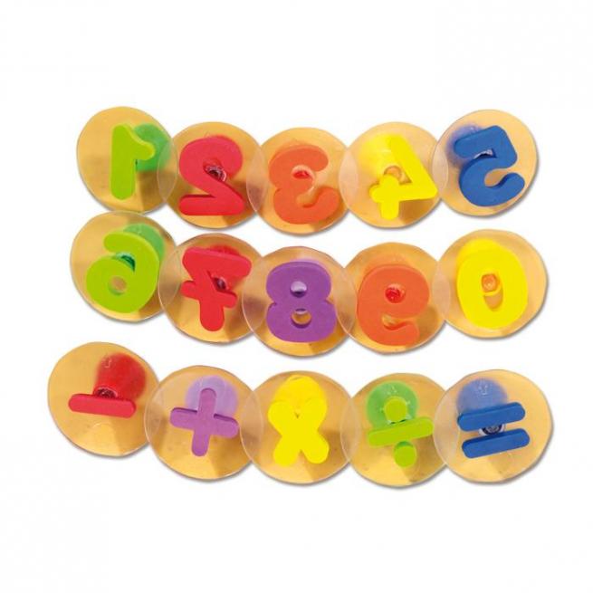 15 Stempel (Zahlen von 0 – 9 und 5 Rechenzeichen) aus Kunststoff, Ø 7,5 cm