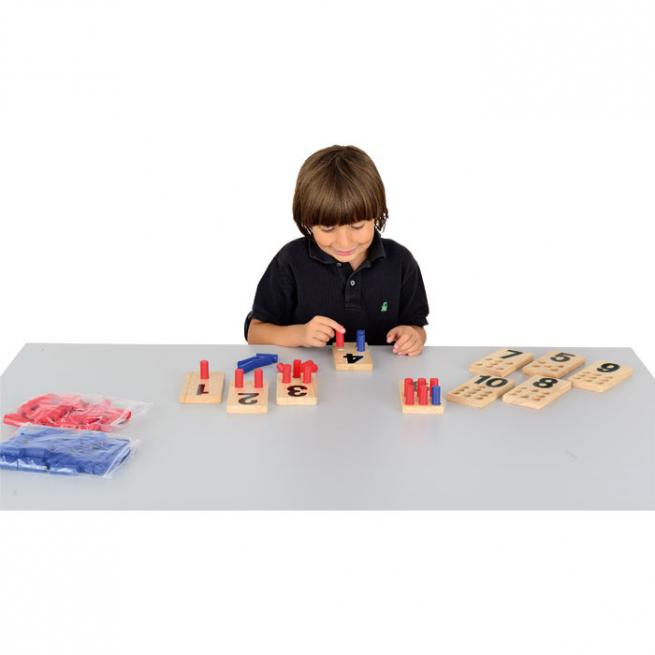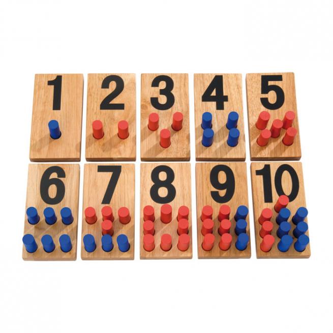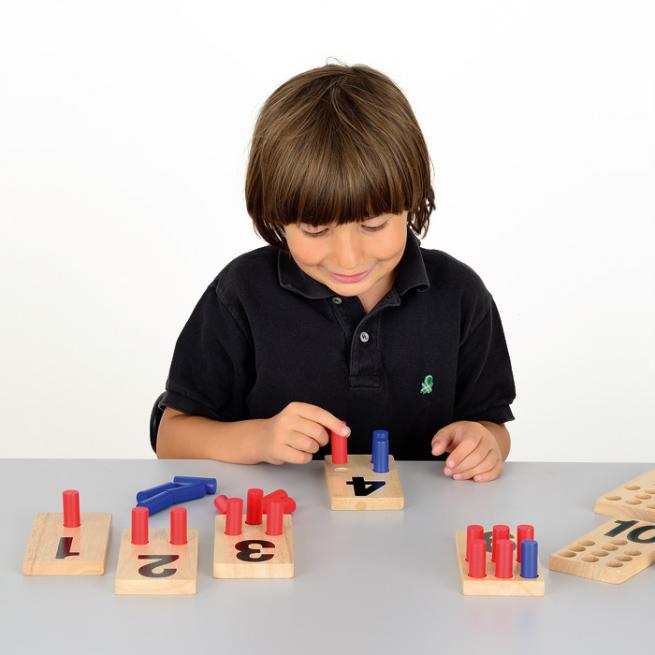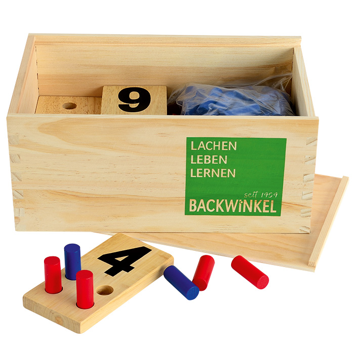 Die Schüler stecken die Stäbe einfach in die Bohrungen und ordnen so die Menge der richtigen Zahl zu. Dabei erkennen sie anhand der noch nicht gefüllten Bohrungen, wie viele Stäbe bis zum Ergebnis noch fehlen. Wechseln die Schüler nun die Farbe der Stäbe, erkennen sie deutlich sichtbar Zahlzerlegung, Addition und Subtraktion. Ab 3 Jahren. Die praktische Holzbox mit Deckel ist perfekt für die saubere und vollzählige Aufbewahrung.