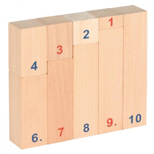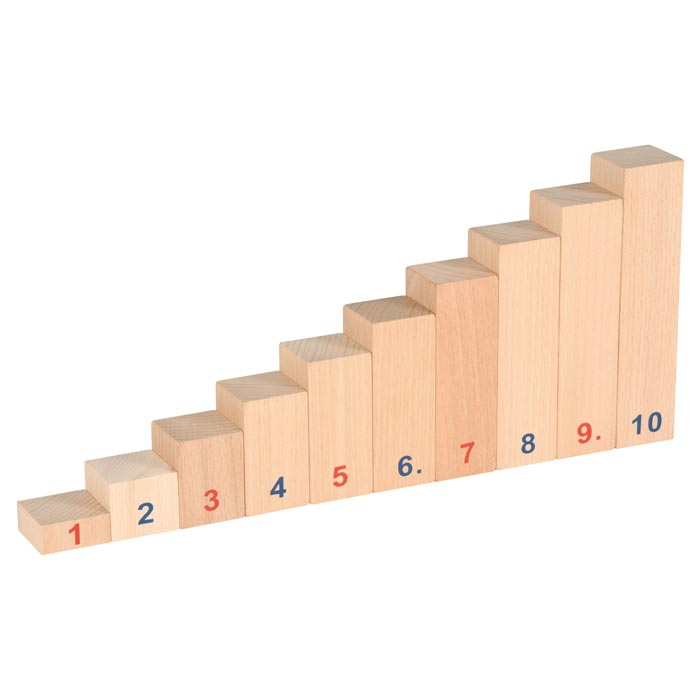 Grundlegende Mathe-Fähigkeiten wie Zahlenmengen sortieren bzw. zuordnen be-greifen Kinder anschaulich mithilfe der Zahlentreppe. Auf jedem der 10 einzelnen Holzblöcke sind die Zahlen von 1 bis 10 gedruckt. Dabei sind die Holzblöcke in der Höhe ihrer jeweilig aufgedruckten Zahl angepasst. Die Stufen der Zahlentreppe steigen somit gleichmäßig an.