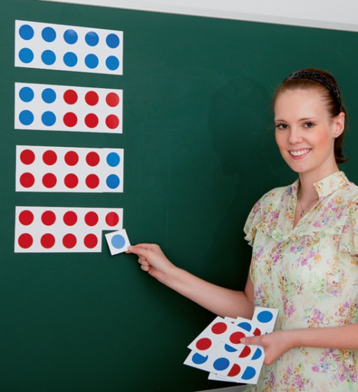 Wie kann die Zahl 10 in andere Mengen zerlegt werden? Um das zu veranschaulichen, stehen Ihnen doppelseitig magnetische Wendekarten zur Verfügung. Damit sind alle Zerlegungen der Zahl 10, bzw. alle Zahlergänzungen möglich sowie Rechenoperationen im Zahlenraum bis 20.
