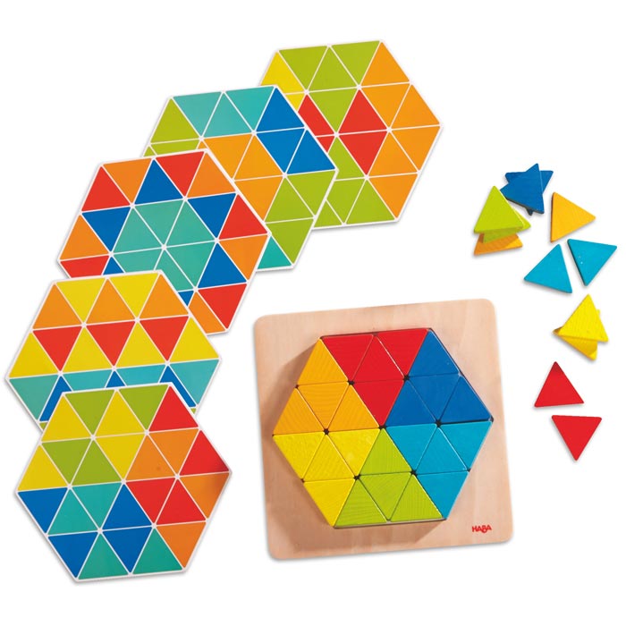 Muster legen, sich mit Farben vertraut machen und in bestimmter Anzahl auf die Vorlage sortieren – all diese Fähigkeiten trainieren die Kleinen mithilfe der Zauberdreiecke. Oder sie gestalten mit den 36 Dreiecken einfach eigene fantastische Muster. Ab 2 Jahren.