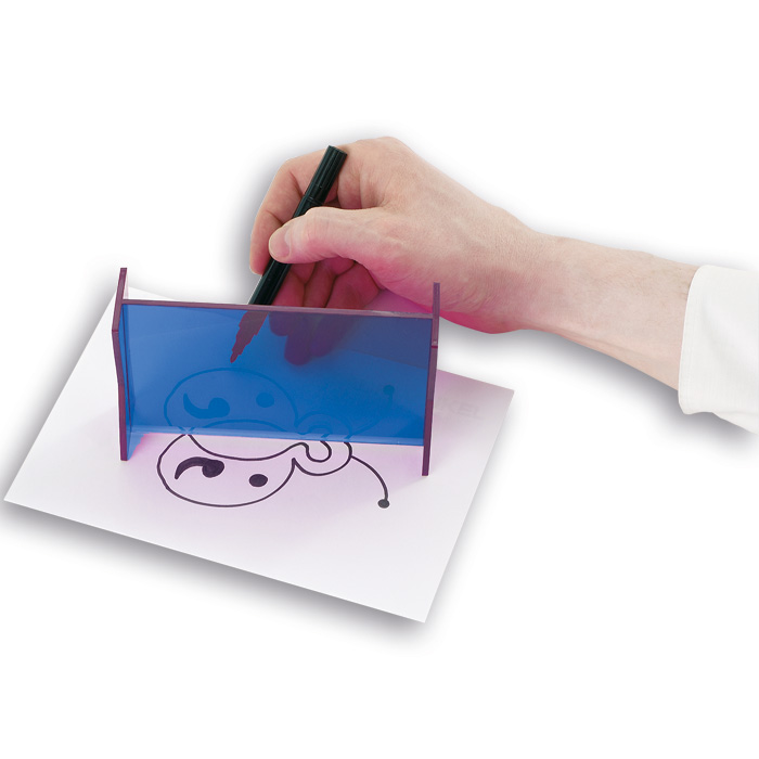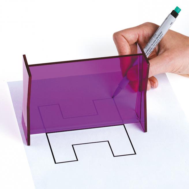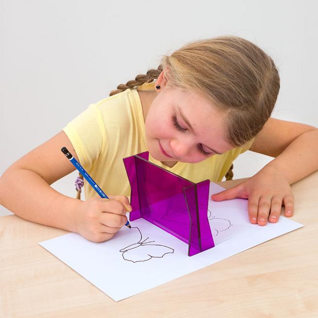 Die Oberfläche reflektiert wie ein Spiegel. Die Kinder schauen aber durch die Scheibe hindurch. Wenn sie z.B. eine Zeichnung vor den Zauberspiegel legen, dann erscheint auf der anderen Seite das Spiegelbild. Man kann es nun einfach nachzeichnen. Der Spiegel aus unzerbrechlichem Kunstglas hat einen abgeschrägten Standfuß, der das Zeichnen direkt am Spiegel erleichtert.