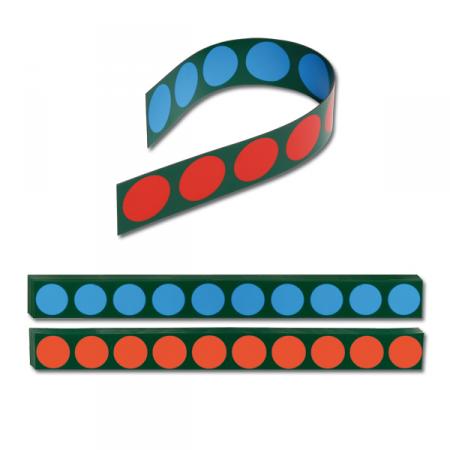 Rechenoperationen in größeren Zahlenräumen sind mit den Zehner-Wendestreifen mit Wendeplättchen schnell dargestellt. Die Streifen sind auf einer Seite mit roten und auf der anderen mit blauen Punkten bedruckt.
