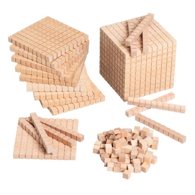 - Tausenderwürfel: 10 x 10 x 10 cm<br/>Hunderterplatte: 10 x 10 x 1 cm<br/>Zehnerstange: 10 x 1 x 1 cm<br/>Einerwürfel: 1 x 1 x 1 cm