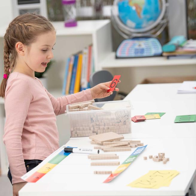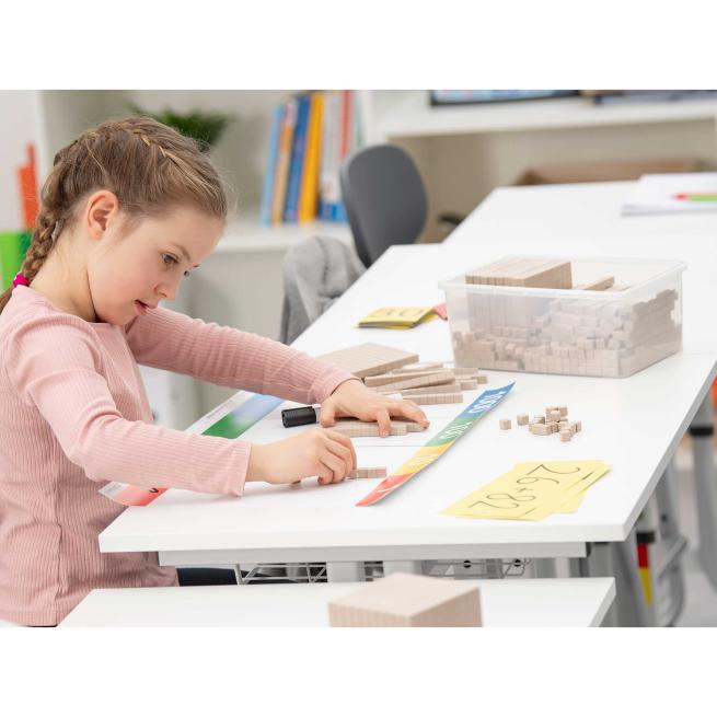 Bei diesem Lernmittel zählen die SuS gleich eins und eins zusammen: Denn im Umgang mit den Würfeln, Stangen und Platten aus dem pflanzenbasierten Biopolymer treeNside merken sie direkt, dass hier etwas anders ist. So lassen die einzelnen Teile deutlich die verarbeiteten Holzfasern erkennen und verströmen einen dezenten und angenehmen Holzgeruch. Das bietet Ihnen eine wunderbare Grundlage, um für die Schüler unmittelbar nachvollziehbar z. B. über Fragen von Umweltschutz und die Verwendung von Ressourcen zu sprechen. Der Zehnersystem-Satz lässt sich daher auch fächerübergreifend, z. B. im Sachkundeunterricht, einsetzen.