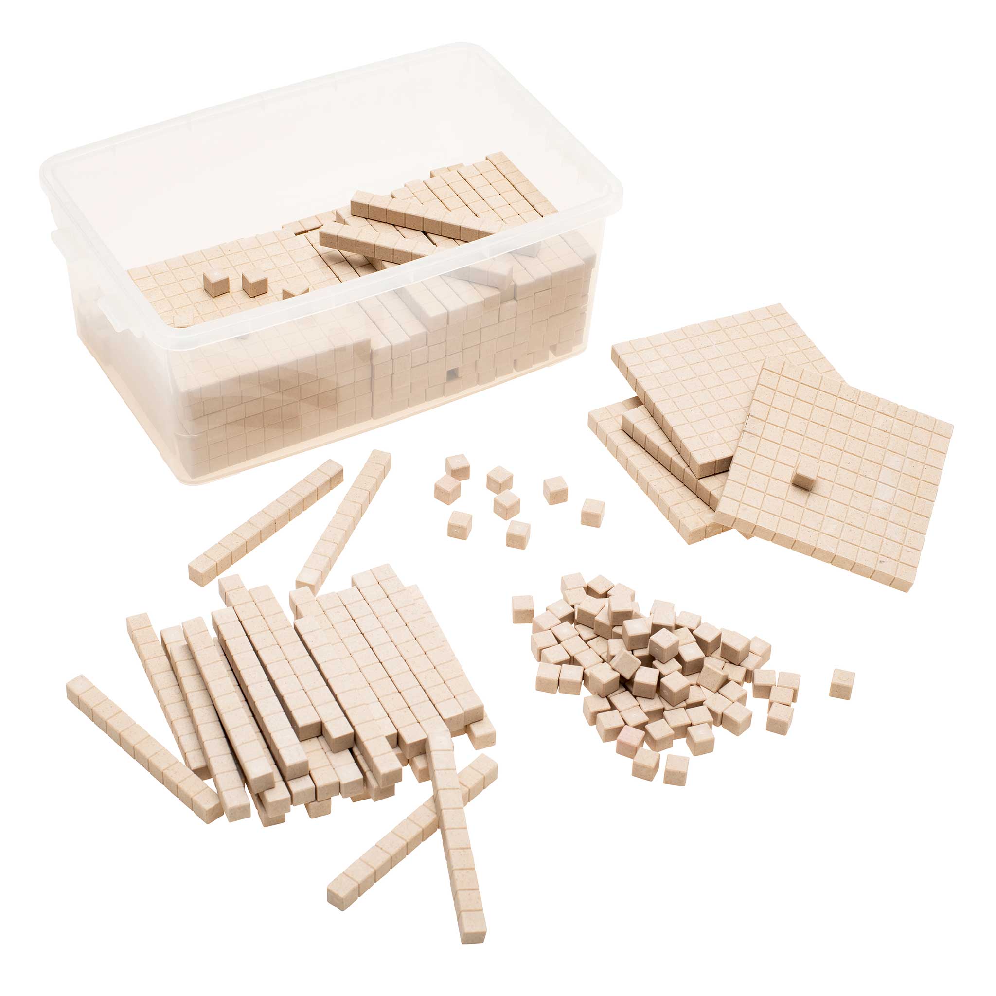 Umfangreiches Set von 300 Einer-Würfeln, 120 Zehner-Stangen sowie 12 Hunderter-Platten aus dem innovativen und langlebigem Biokunststoff treeNside, hergestellt in Deutschland. Der Zehnersystem-Satz hilft Ihren SuS dabei, intuitiv und ansprechend den Zahlenraum bis 100 zu durchdringen. Ihre Schüler erschließen sich haptisch mathematische Grundrechenarten, wie Addition und Subtraktion. Durch das Auslegen unterschiedlicher Zahlenwerte z. B. mithilfe der Einer- und Zehner-Steine erfassen die Kinder im Handumdrehen Zehnerübergänge sowie Mengen und deren Zerlegung. So nehmen Ihre Schüler Mathematik im wahrsten Sinne des Wortes in die eigenen Hände. Apropos: Alle Teile lassen sich schnell in der mitgelieferten und stapelbaren Aufbewahrungs-Box verstauen und bleiben so stets sortiert und staubfrei.