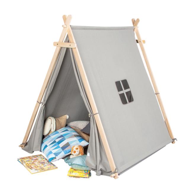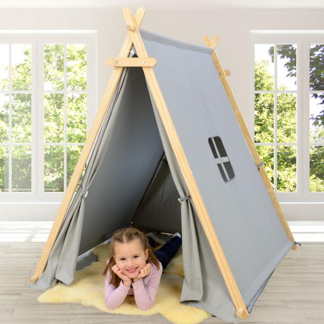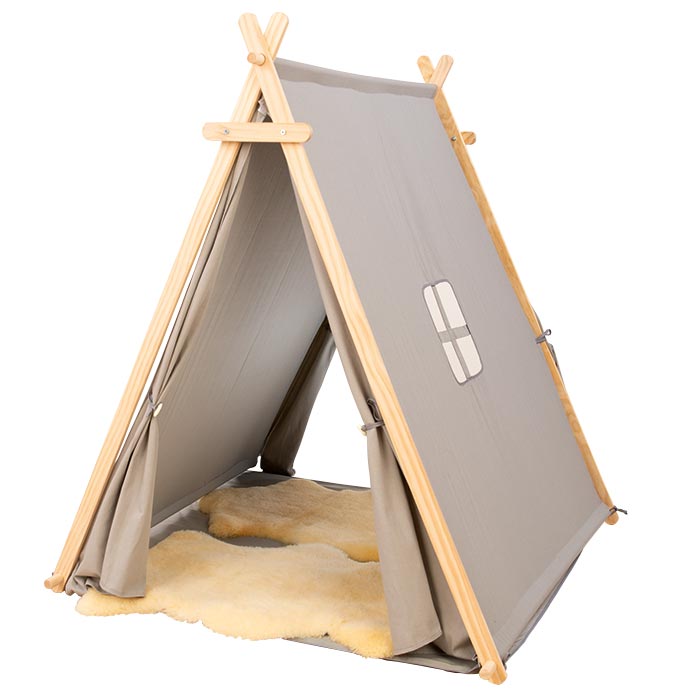 Heimeliger Rückzugsort für kleine Camper. Im Nu stellen Sie das Gestell aus vollmassiver Kiefer auf und befestigen die Zeltwände sowie die weiche Bodenmatte aus robustem, grauem Stoff. Eine Zeltwand hat ein Fenster. Bei Nichtgebrauch bewahren Sie das Zelt einfach im beiliegenden praktischen Beutel auf. Zur einfachen Selbstmontage.