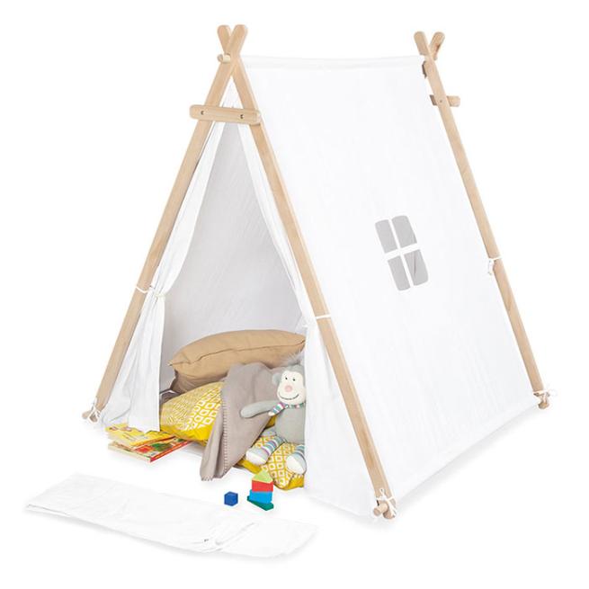 Heimeliger Rückzugsort für kleine Camper. Im Nu stellen Sie das Gestell aus vollmassiver Kiefer auf und befestigen die Zeltwände sowie die weiche Bodenmatte aus robustem, grauem Stoff. Eine Zeltwand hat ein Fenster. Bei Nichtgebrauch bewahren Sie das Zelt einfach im beiliegenden praktischen Beutel auf. Zur einfachen Selbstmontage.