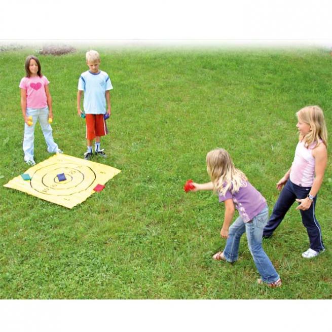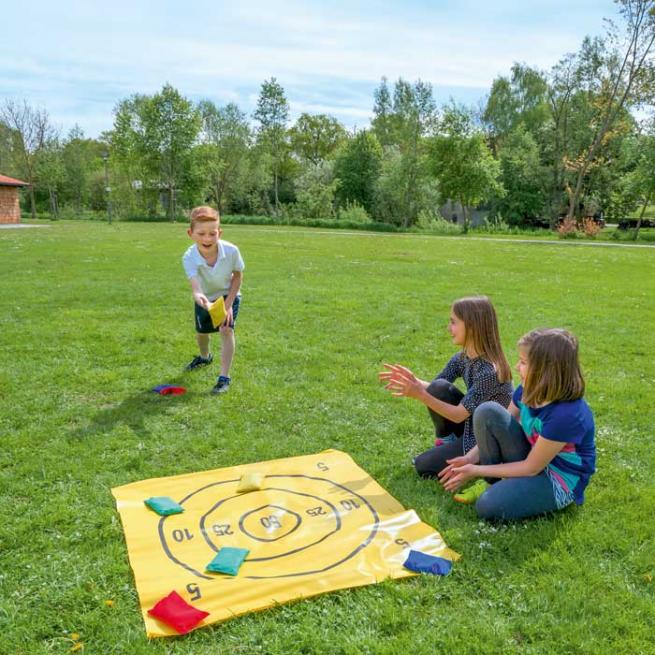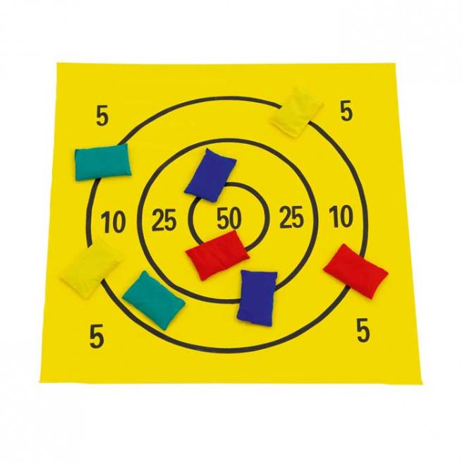 Ihre Schüler werfen mit den farbigen Bohnensäckchen möglichst genau auf die Matte. Die Matte ist ähnlich wie bei einer Zielscheibe in Punktebereiche aufgeteilt. Wer hier mit viel Gefühl wirft und genau zielt, erhält am Ende die meisten Punkte.