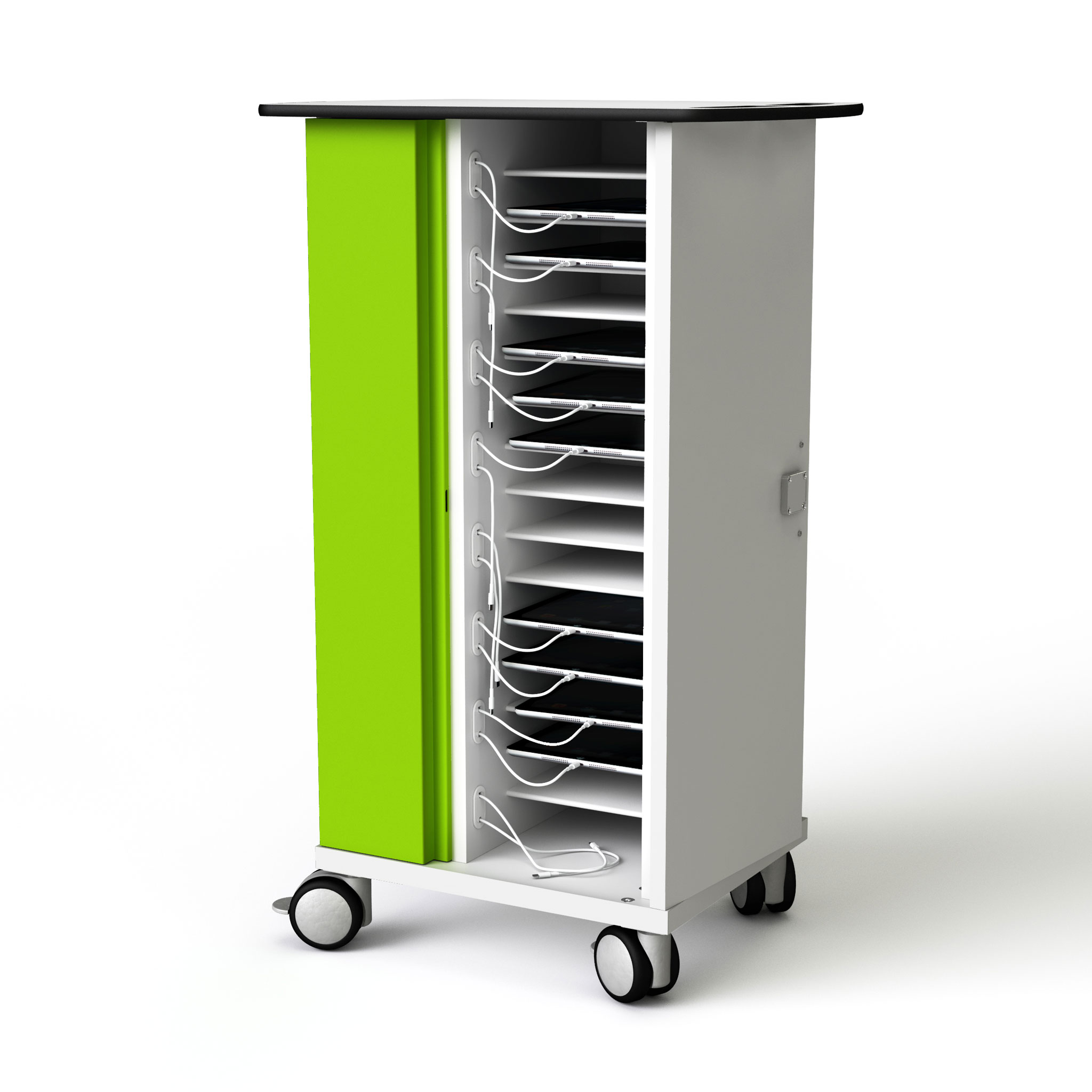 Dank durchdachtem Kabelmanagementsystem vermeiden Sie Kabelsalat und nutzen immer nur ein angemessen kurzes Stück Ihres Hersteller-Ladekabels für das jeweilige Endgerät. Für den leichten Zugang lassen sich die Türen des Ladewagens um 270° zurückklappen. Die elektrische Schachtabdeckung ist modellgebunden farbig abgesetzt. Mit vier leichtgängigen, feststellbaren Rollen, Grifflöchern und Belüftung. Wahlweise mit Schlüssel-, Code- oder Kartenschloss. Das Kartenschloss nutzt die RFID-Technologie (Radio-Frequenz Identifikation).