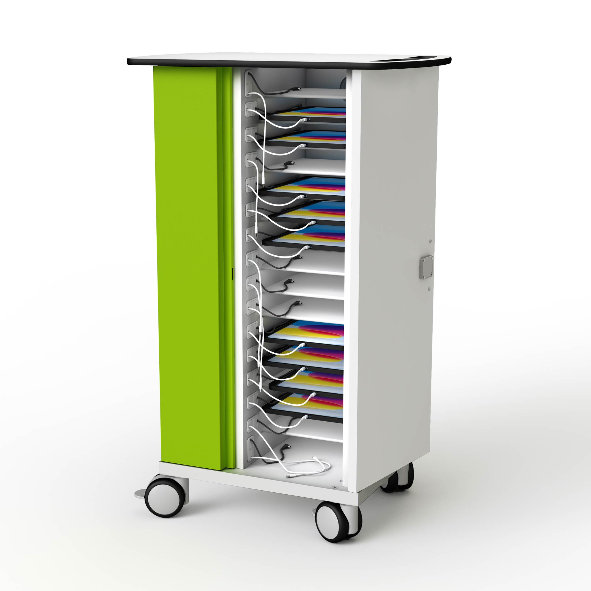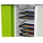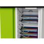 Dank durchdachtem Kabelmanagementsystem vermeiden Sie Kabelsalat und nutzen immer nur ein angemessen kurzes Stück Ihres Hersteller-Ladekabels für das jeweilige Endgerät. Für den leichten Zugang lassen sich die Türen des Ladewagens um 270° zurückklappen. Die elektrische Schachtabdeckung ist modellgebunden farbig abgesetzt. Mit vier leichtgängigen, feststellbaren Rollen, Grifflöchern und Belüftung. Wahlweise mit Schlüssel-, Code- oder Kartenschloss. Das Kartenschloss nutzt die RFID-Technologie (Radio-Frequenz Identifikation).