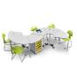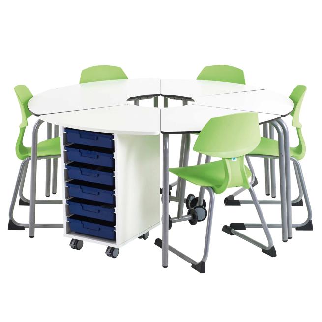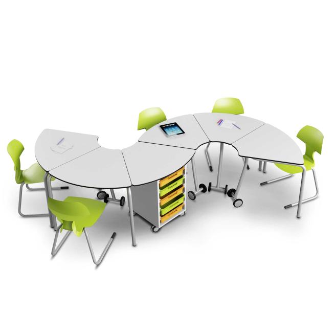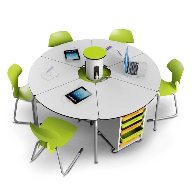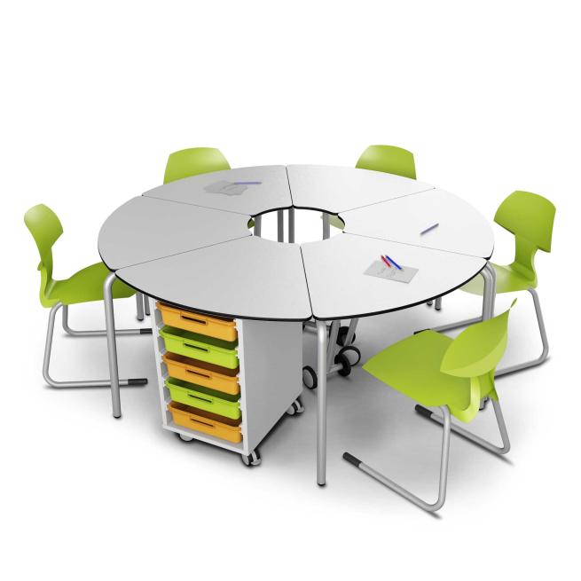 Die zioxi t41-Einzeltische ordnen Sie z. B. in Reihen, Wellen oder in Gruppen an und schaffen so in Ihrer Klasse optimale Lernsituationen. Erhältlich als keilförmige 60°- bzw. rechteckige 180°-Einzeltische. Anhand der Räder am mittleren Tischbein bewegen Sie die Arbeitsplätze leicht im Raum. Aufgrund der gerundeten Enden am oberen Teil der Platte ergeben sich durch die Kombination mehrerer Tische eine oder mehrere kreisrunde Aussparungen in der Mitte. Dort hinein passt der powerHub-Turm optimal. Mit 6 keilförmigen 60°-Tischen bilden Sie z. B. einen Kreis. Mit den quadratischen 180°-Tischen erweitern Sie die Anordnungsmöglichkeiten. Zum platzsparenden Verstauen klappen Sie die Platte einfach um und schieben die Tische zusammen.