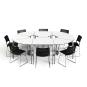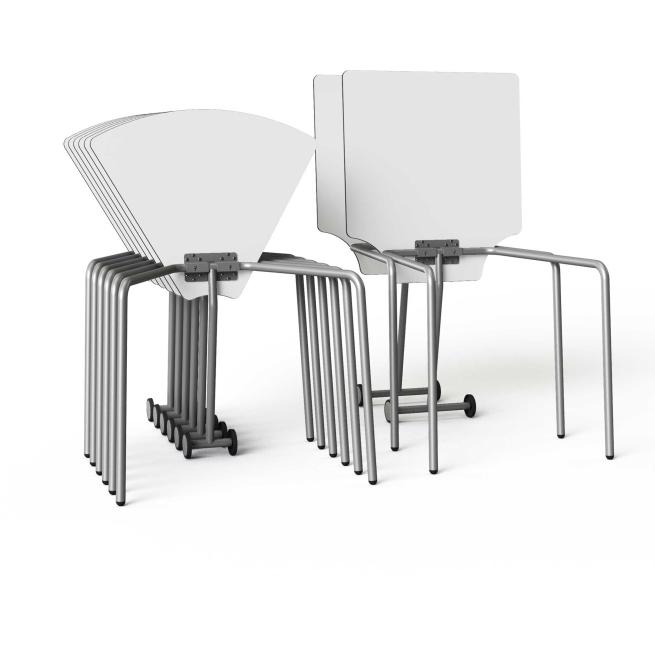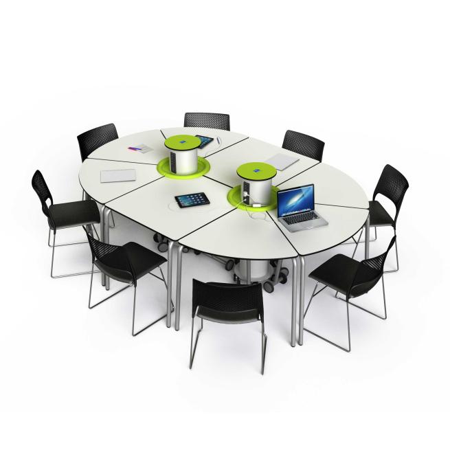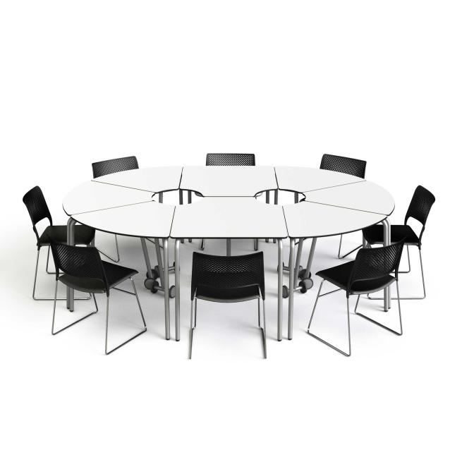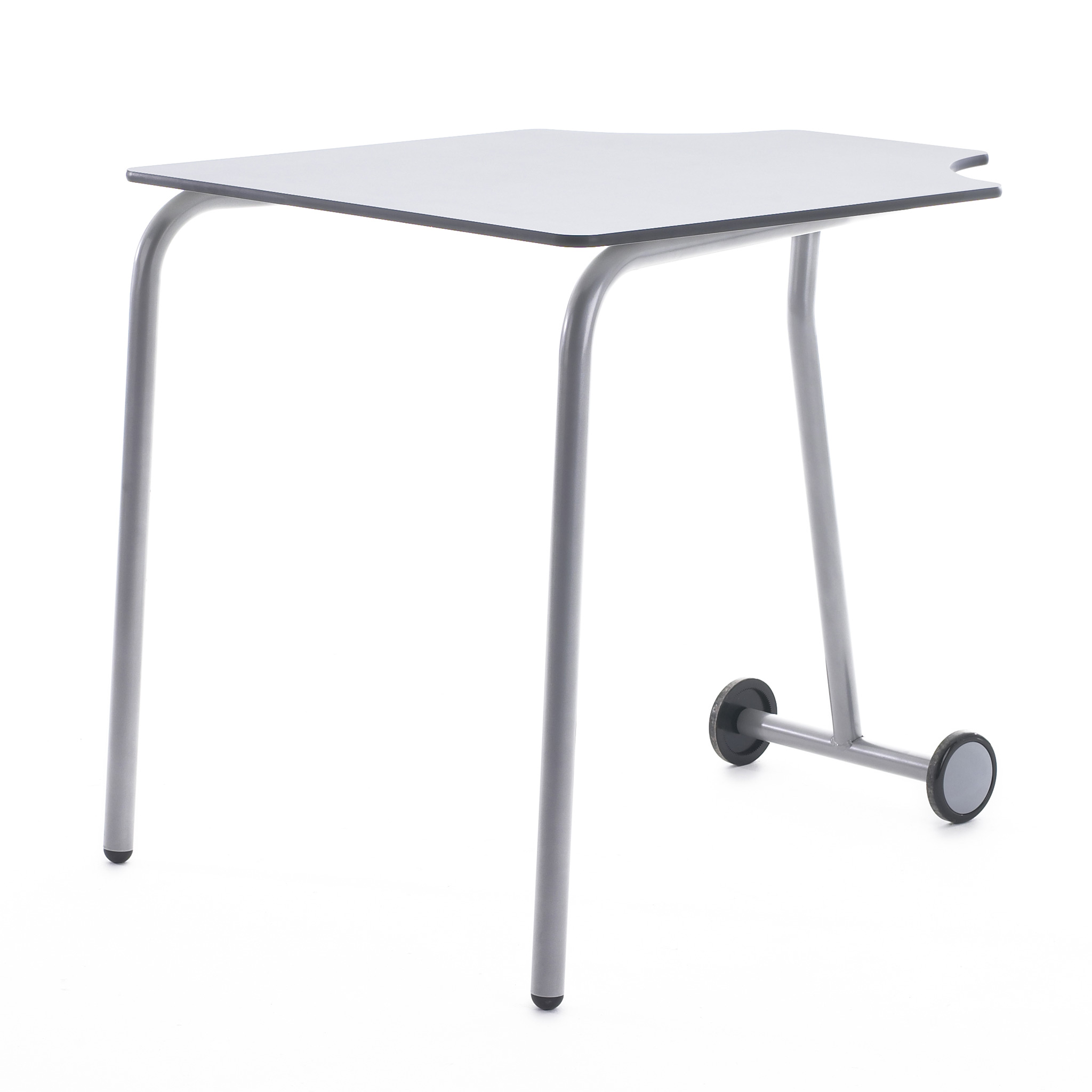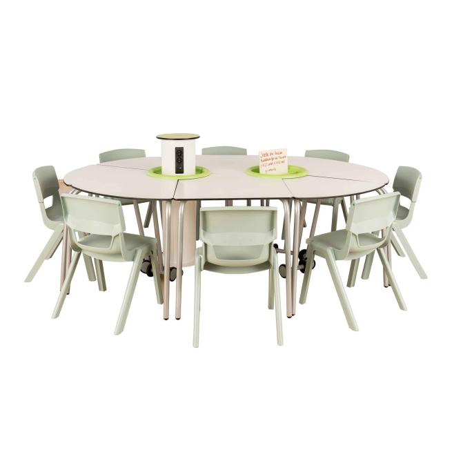Anpassungsfähiges Klassenzimmer next Level. Die rechteckigen zioxi t41-Einzeltische ordnen Sie z. B. in Reihen oder Gruppen an und schaffen so in Ihrer Klasse optimale Lernsituationen. Anhand der Räder am mittleren Tischbein bewegen Sie die Arbeitsplätze leicht im Raum. Aufgrund der gerundeten Enden am oberen Teil der Platte ergeben sich durch die Kombination mehrerer Tische eine oder mehrere kreisrunde Aussparungen in der Mitte. Dort hinein passt der powerHub-Turm optimal. Mit den keilförmigen 60°-Tischen erweitern Sie die Anordnungsmöglichkeiten. Zum platzsparenden Verstauen klappen Sie die Platte einfach um und schieben die Tische zusammen.