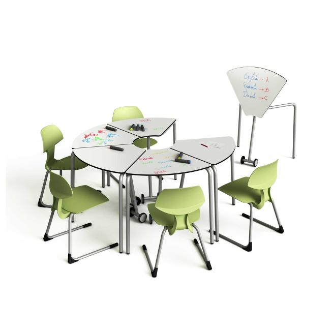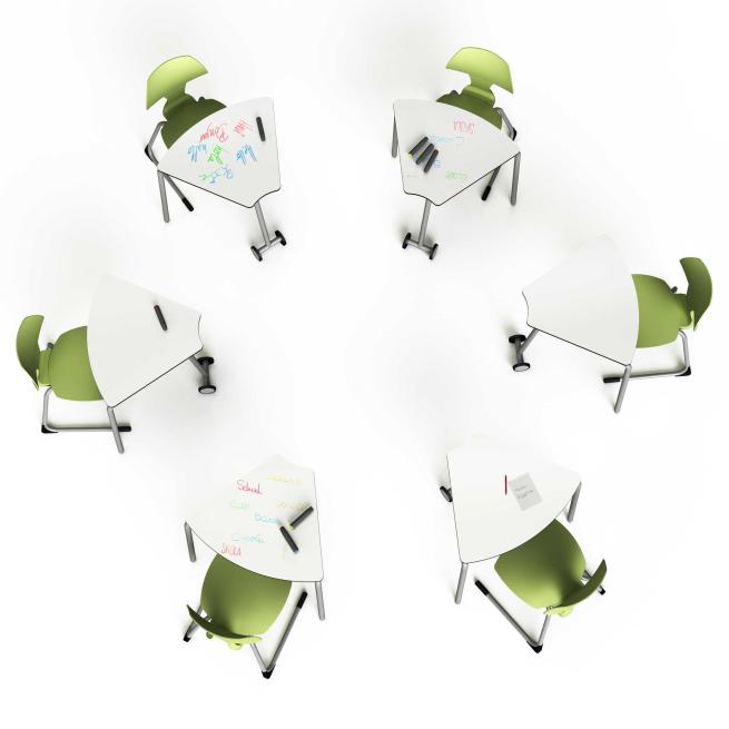 Anpassungsfähiges Klassenzimmer next Level. Die zioxi t41-Einzeltische ordnen Sie z. B. in Reihen, Wellen oder in Gruppen an und schaffen so in Ihrer Klasse optimale Lernsituationen. Erhältlich als keilförmige 60°- bzw. rechteckige 180°-Einzeltische. Anhand der Räder am mittleren Tischbein bewegen Sie die Arbeitsplätze leicht im Raum. Aufgrund der gerundeten Enden am oberen Teil der Platte ergeben sich durch die Kombination mehrerer Tische eine oder mehrere kreisrunde Aussparungen in der Mitte. Dort hinein passt der powerHub-Turm optimal. Mit 6 keilförmigen 60°-Tischen bilden Sie z. B. einen Kreis. Mit den quadratischen 180°-Tischen erweitern Sie die Anordnungsmöglichkeiten. Zum platzsparenden Verstauen klappen Sie die Platte einfach um und schieben die Tische zusammen.