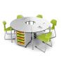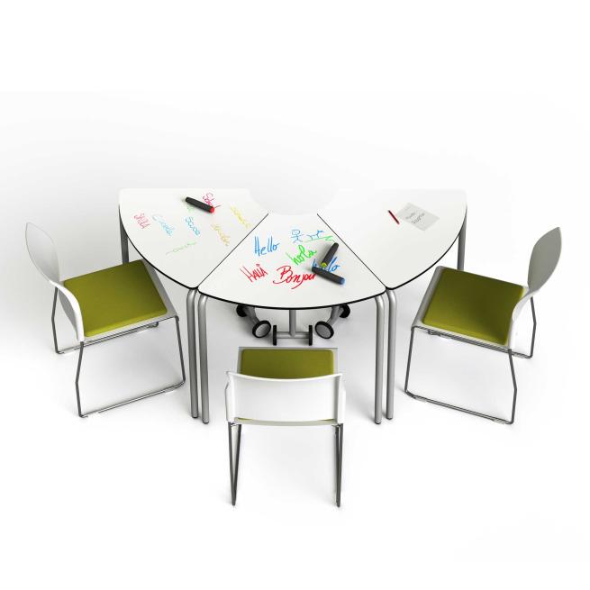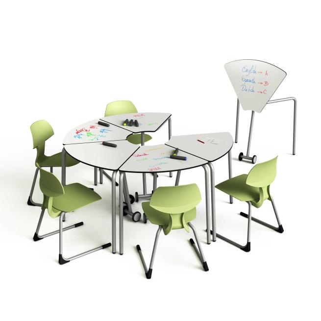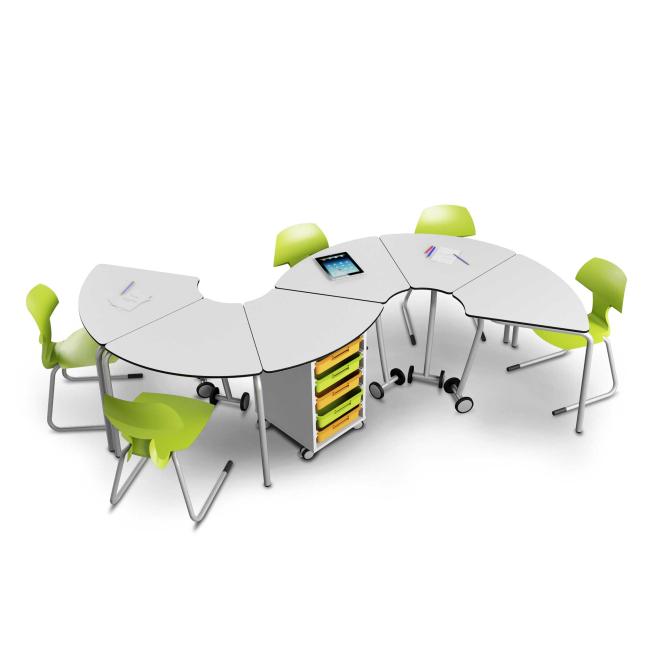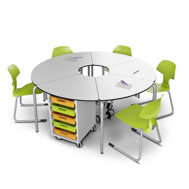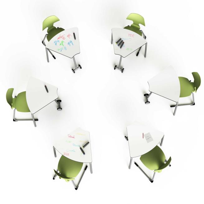 Anpassungsfähiges Klassenzimmer next Level. Die zioxi t41Plus-Einzeltische ordnen Sie z. B. in Reihen, Wellen oder in Gruppen an und schaffen so in Ihrer Klasse optimale Lernsituationen. Erhältlich als keilförmige 60°- bzw. rechteckige 180°-Einzeltische. Anhand der Räder am mittleren Tischbein bewegen Sie die Arbeitsplätze leicht im Raum. Aufgrund der gerundeten Enden am oberen Teil der Platte ergeben sich durch die Kombination mehrerer Tische eine oder mehrere kreisrunde Aussparungen in der Mitte. Dort hinein passt der powerHub-Turm optimal. Mit 6 keilförmigen 60°-Tischen bilden Sie z. B. einen Kreis. Mit den quadratischen 180°-Tischen erweitern Sie die Anordnungsmöglichkeiten. Zum platzsparenden Verstauen klappen Sie die Platte einfach um und schieben die Tische zusammen.