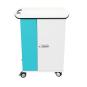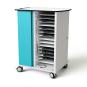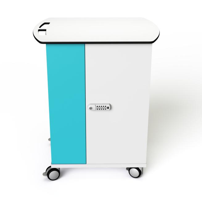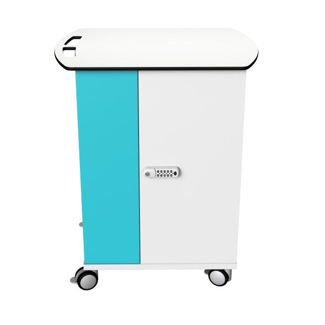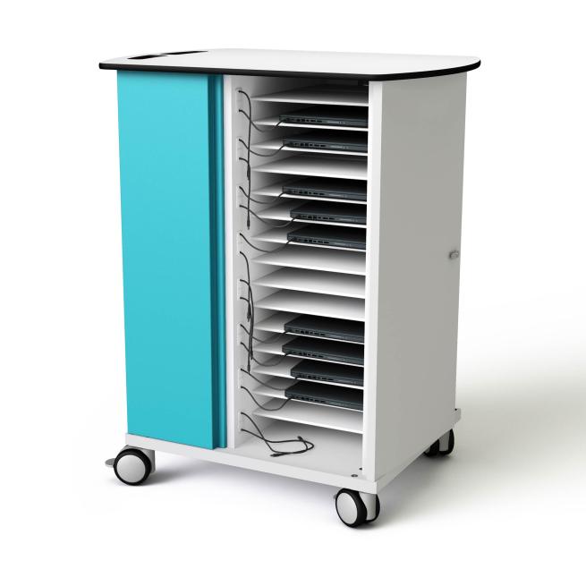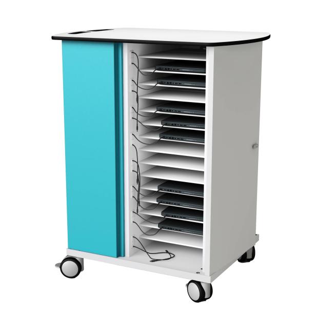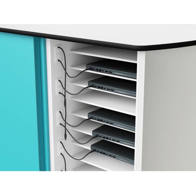 In der fahrbaren Ladestation versorgen Sie 16 Laptops mit Strom. Ausgelegt sind die Fächer auf Geräte bis maximal 16 Zoll Bildschirmdiagonale. Ein Ethernet-Switch mit USB-C-Kabeln bietet baut ein Netzwerk auf. Über einen externen RJ45-Port verbinden Sie sich mit diesem. Die Türen der Station sind um 270° klappbar. Ausgestattet mit einem separaten Kabelspeicher. Kabelsalat ist damit und durch die kurzen Kabellängen in jedem Fach kein Thema. Auch die Ladebuchsen sind so vor Beschädigungen geschützt. Während die mobilen Geräte in der smarten Station laden, haben Sie die Gelegenheit, Ihren SuS analoge Lernumgebungen anzubieten. Beim Wechsel in digitale Arbeitsphasen stehen dann vollständig geladene Geräte zur Verfügung. Wahlweise mit Schlüssel- oder Codeschloss.