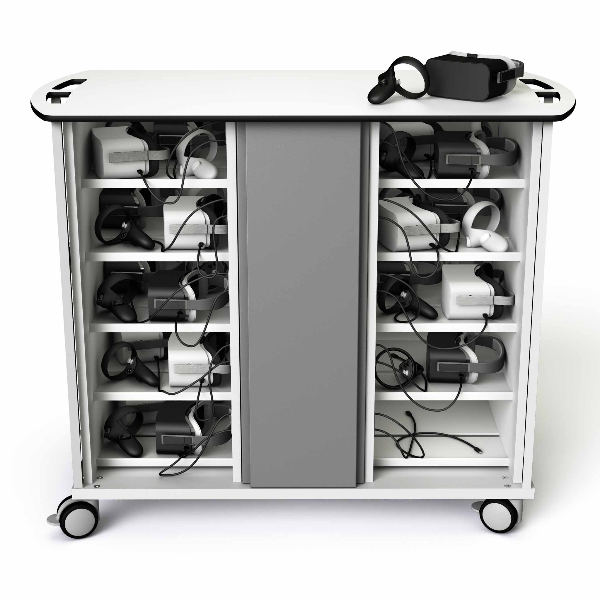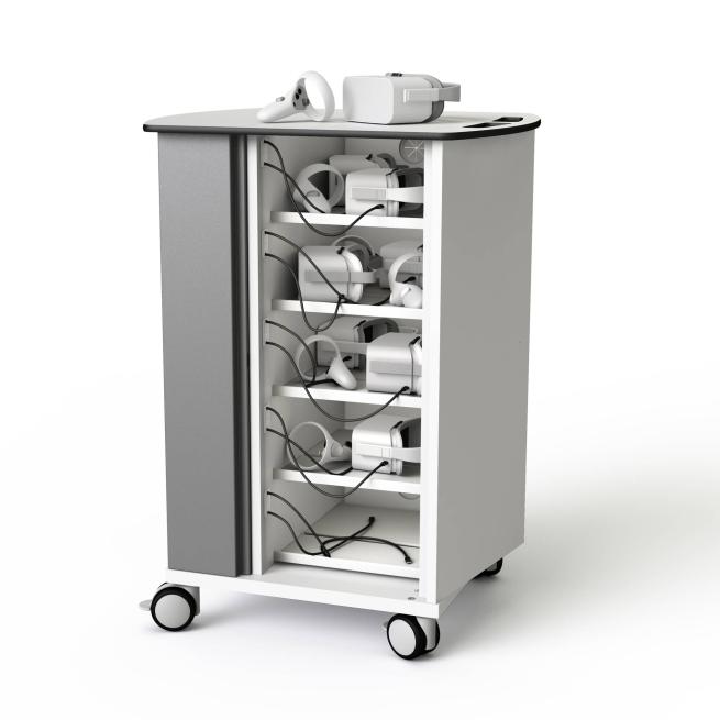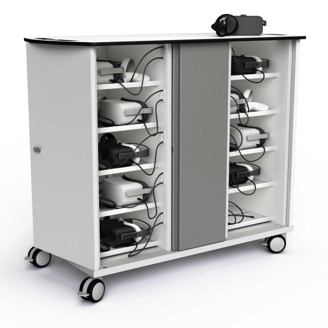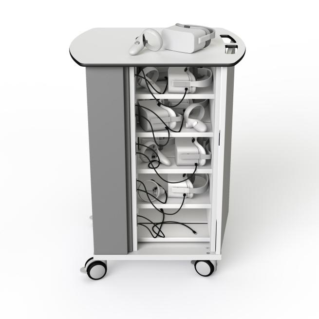 Die innovativen, hochmodernen Ladewagen bieten Ihrer Schule immer die richtige Lösung zum Aufbewahren und Aufladen Ihrer Headsets. In diesem Ladewagen finden VR-Brillen ihren Platz. Je nach Modell verstauen und laden Sie über die USB-C-Anschlüsse bis zu 40 VR-Brillen mit flexiblen Kopfbändern oder 20 VR-Brillen mit starren Kopfbändern.